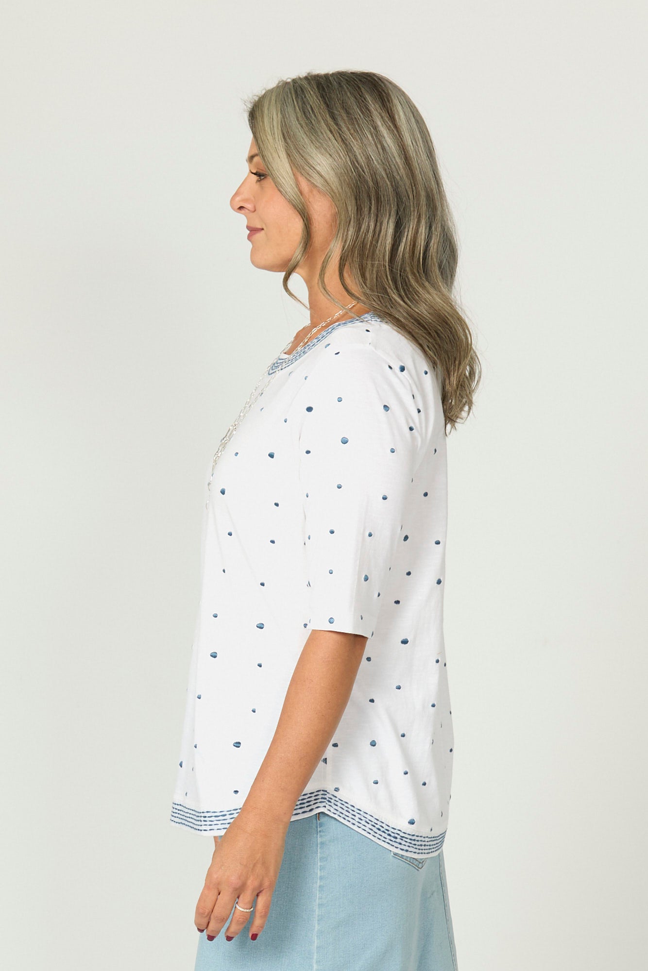 Refresh your wardrobe with the playful charm of the Addison Elbow Sleeve Spot Top in White/Blue. Featuring a classic polkadot print, this breezy style is accented with stitched trim detailing for added character. The wide neckline and elbow-length sleeves create a flattering shape, while the set-in sleeve ensures a polished finish perfect for casual or elevated looks.