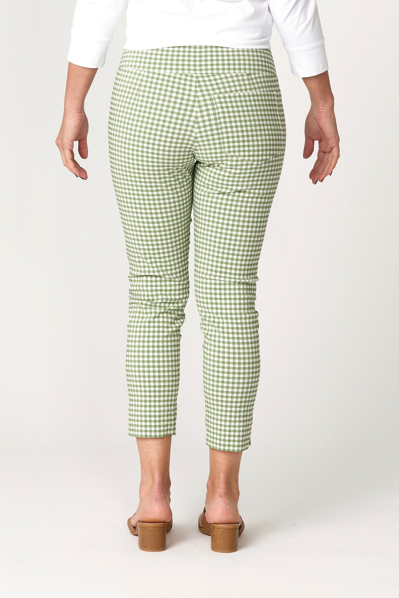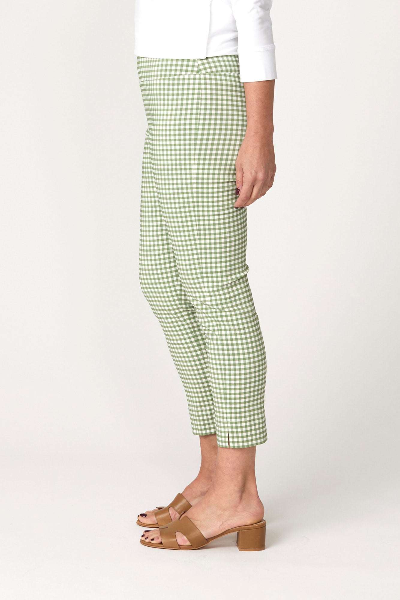 Add timeless flair to your wardrobe with the Bayside Check 7/8 Basque Pant in Basil. These classic straight-leg pants feature a tailored check print and a flattering 7/8 length, perfect for versatile styling. Crafted from stretch woven fabric, they offer ease of movement and a comfortable pull-on fit, while subtle side hem splits complete the look with a refined touch.