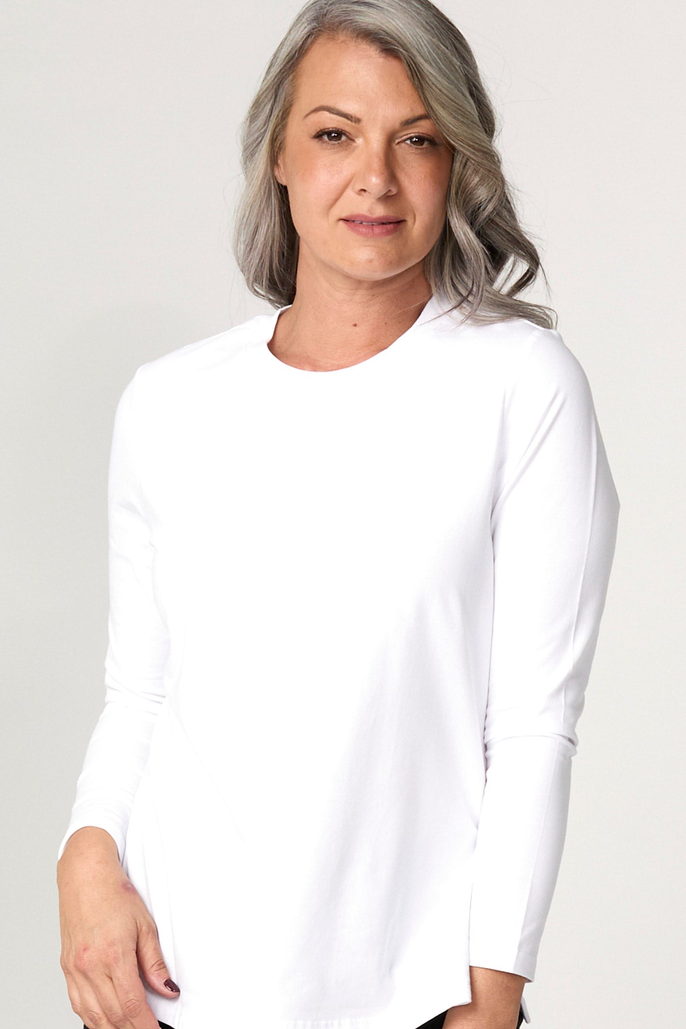 Elevate your essentials with the Baz Side Split Long Sleeve Top in White. With a clean round neckline and subtle side hem detailing, this top is a versatile layering piece for effortless everyday wear. The soft finish and set-in sleeves add structure to its relaxed silhouette, making it both comfortable and polished.
