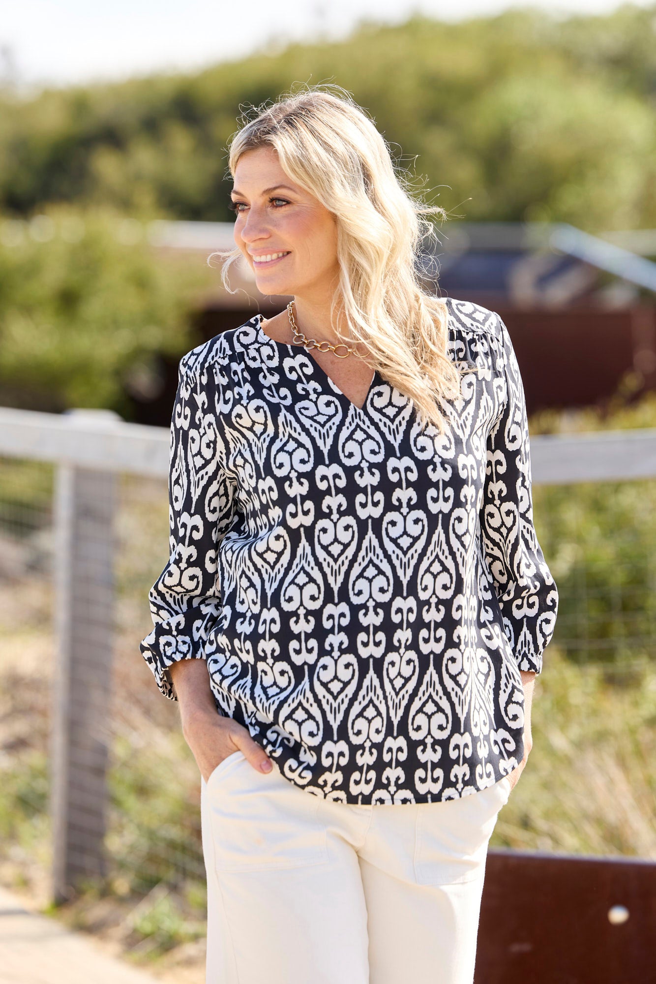 Add a touch of bold sophistication with the Billi Aztec 3/4 Sleeve Blouse in Black and Ivory. Designed with an ikat-inspired print and made in Australia, this blouse blends artisanal flair with easy elegance. Its lightweight, soft fabrication and relaxed cut make it an effortless option for everyday comfort with standout style.