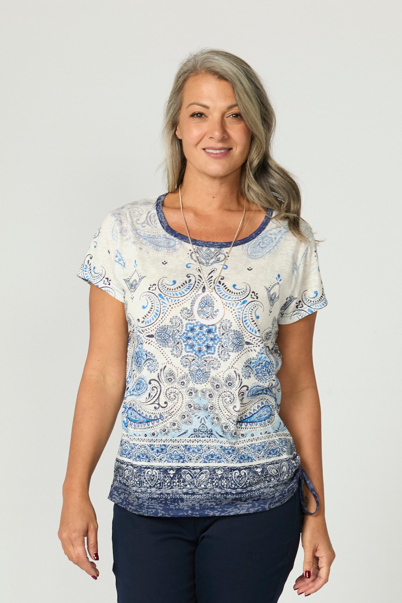 Channel carefree charm with the Blue Boho Short Sleeve Ruched Tee in Indigo. Featuring a paisley-inspired print and a flattering round neckline with contrast binding, this tee adds a pop of personality to casual dressing. The adjustable drawcord ties at the hem let you customise the fit for comfort and style.