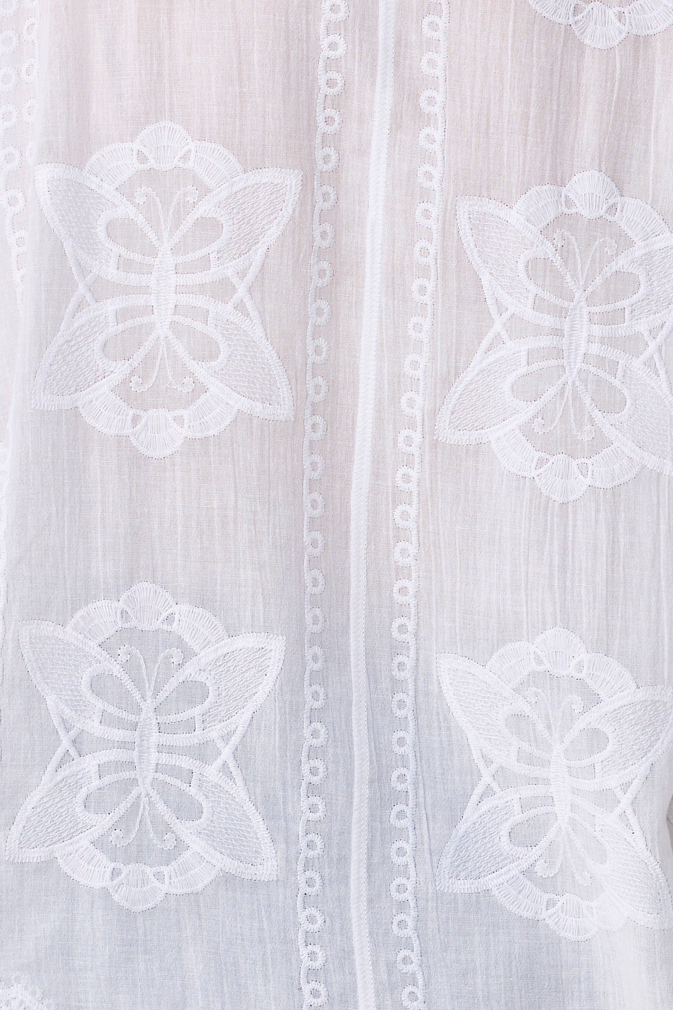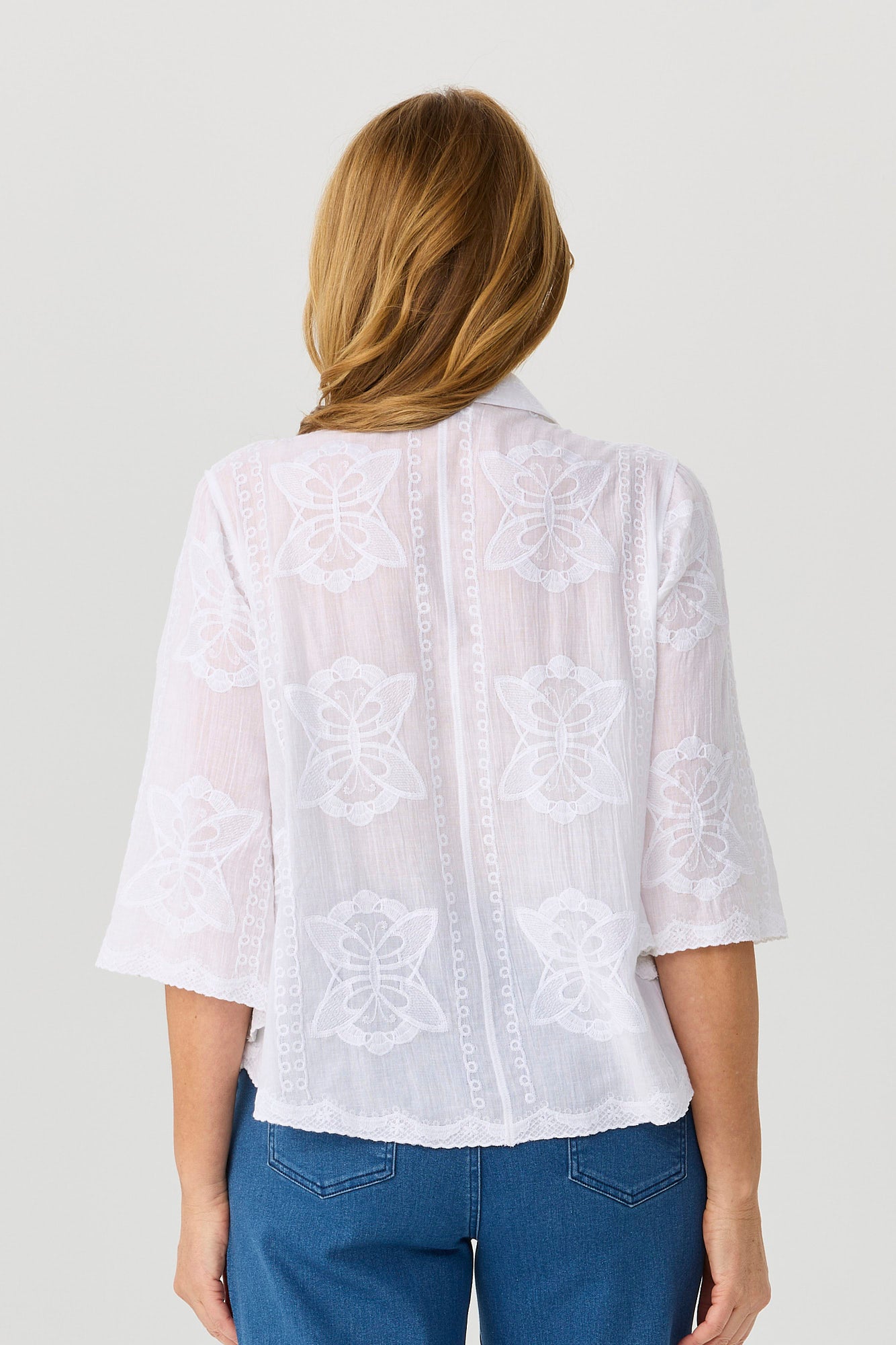 Breathe new life into your wardrobe with the Butterfly Bell Sleeve Shirt in White. Crafted from pure cotton, this elegant blouse is elevated by delicate embroidery and an effortlessly feminine bell sleeve silhouette. The classic collar and button-down front bring a timeless touch to its graceful design, making it ideal for both casual charm and refined layering.