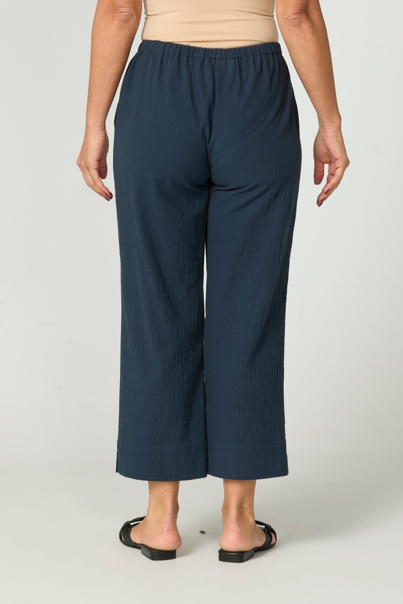 Discover breezy comfort and effortless style with the Cable Beach Crop Pant in Ink. These relaxed wide-leg pants feature a cropped length perfect for warm weather, while the elasticated waist ensures a snug fit. The lightweight cotton fabric provides breathable comfort, and the hem side splits add a playful touch. With front side inner pockets, these pants are as practical as they are stylish.