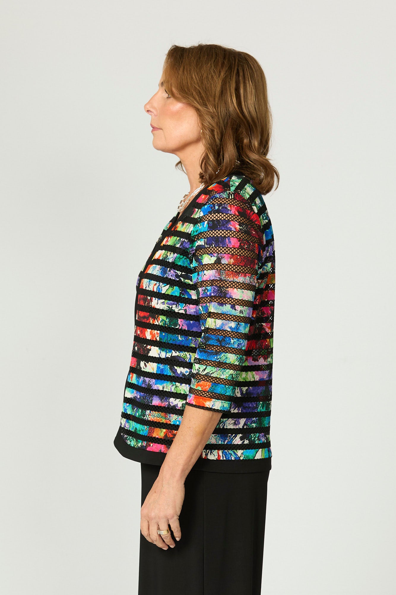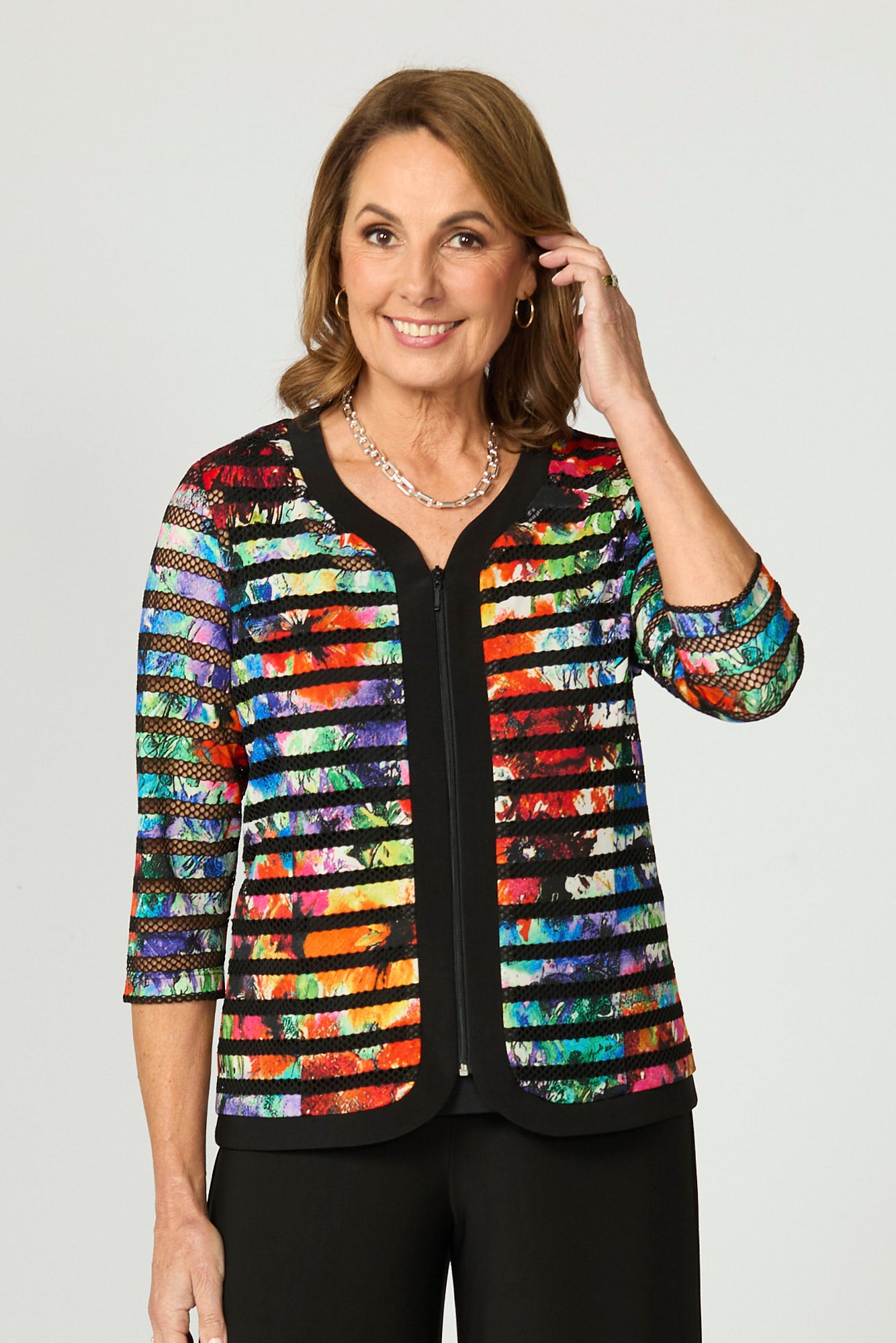 Step into effortless elegance with the Camille Zip Front Cardigan in Multi. Made in Australia, this beautifully printed piece features a delicate floral design accented by lace trim inserts. The contrast curved neckline and hem add a refined touch, while the zip front and 3/4 sleeves make it both stylish and practical.
