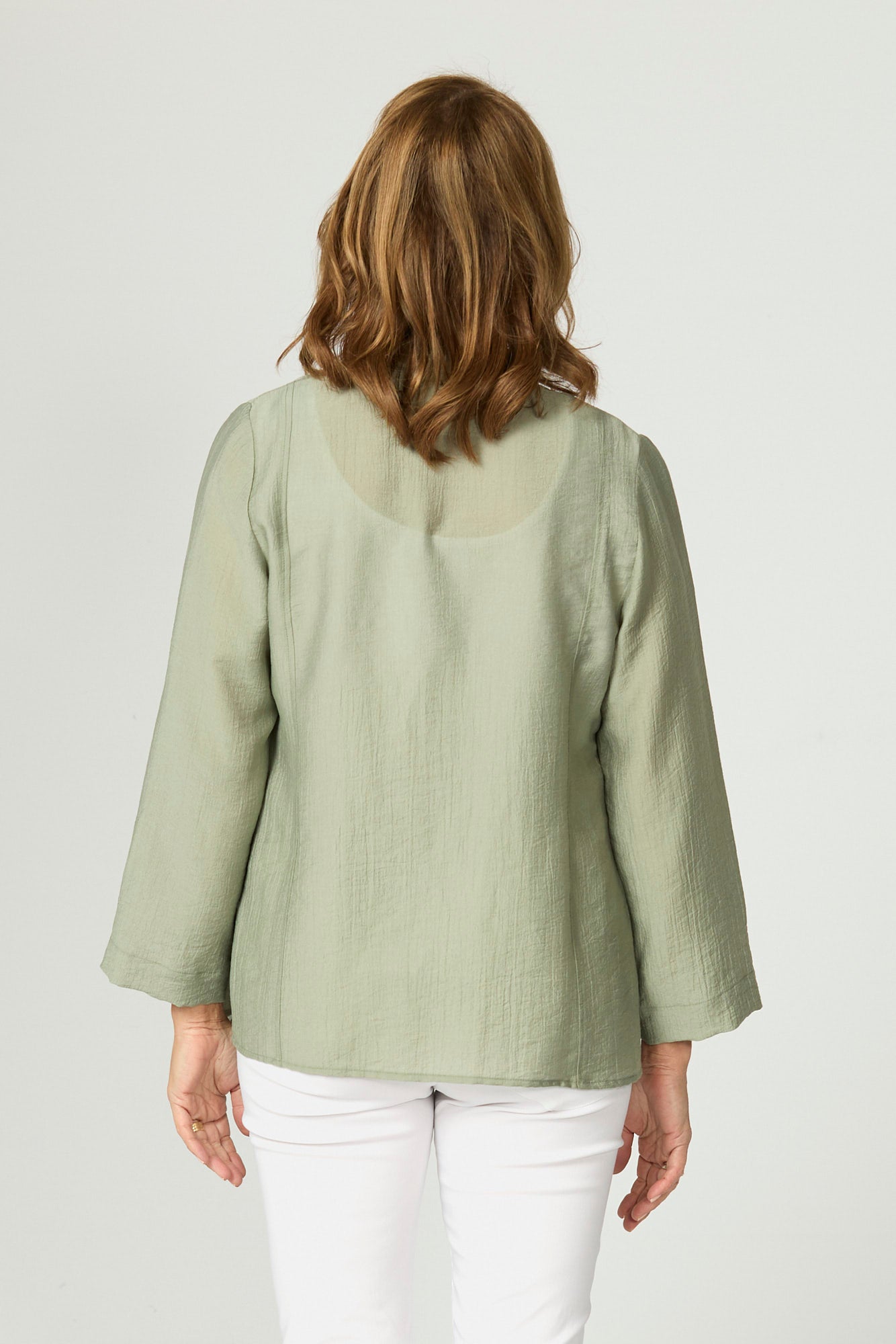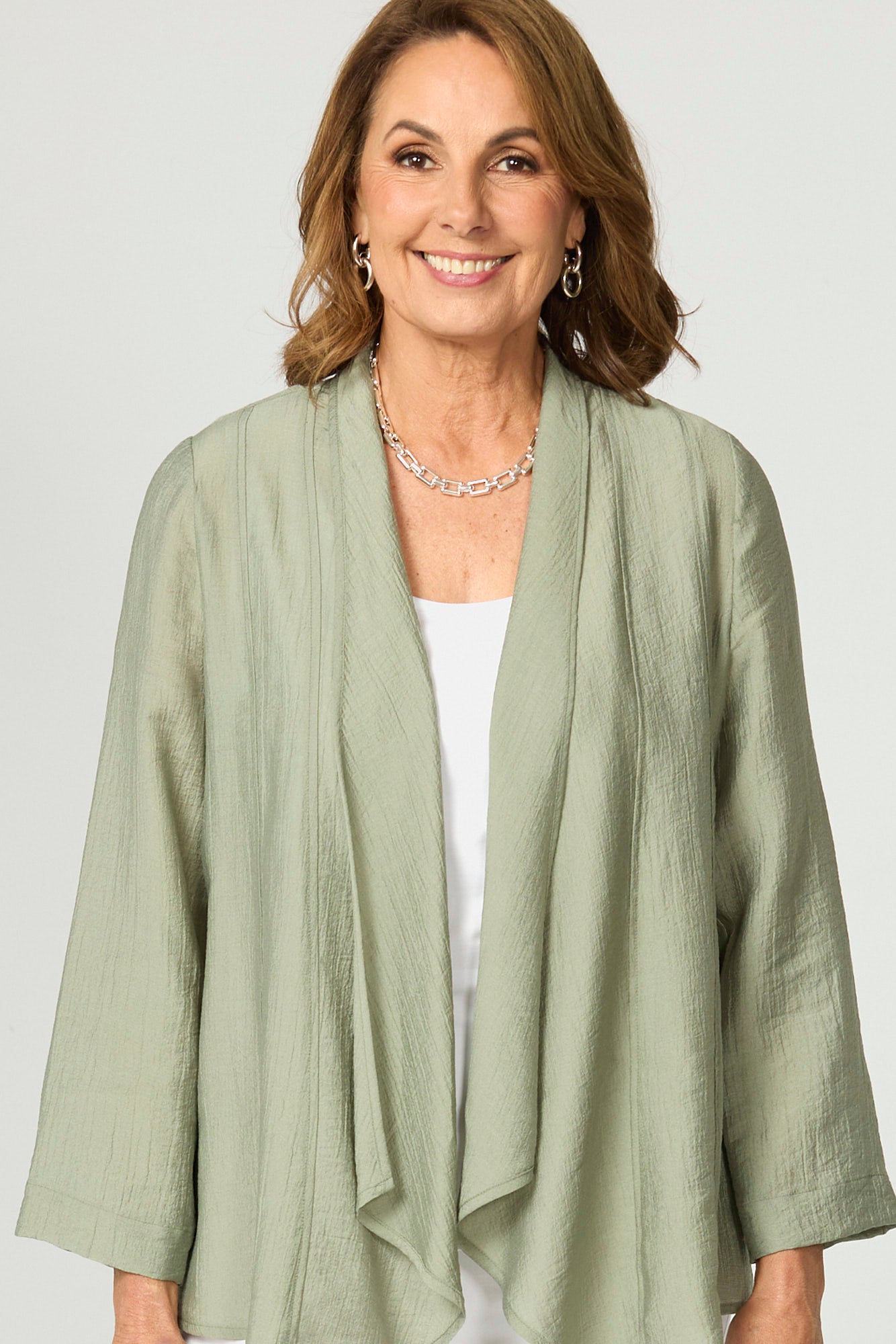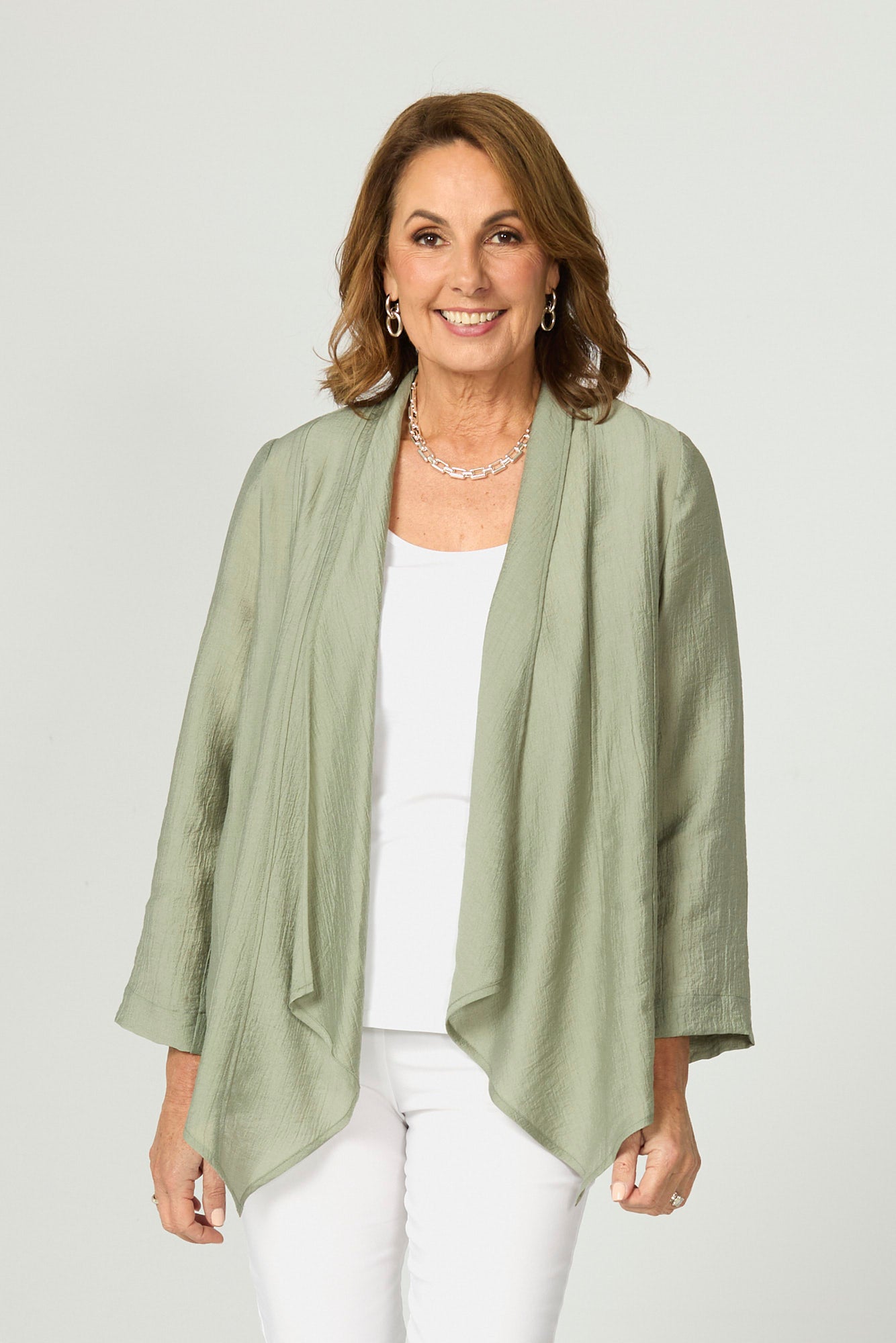 Enhance your wardrobe with the Casino 3/4 Sleeve Waterfall Jacket in Sage. This lightweight cardigan features a cascading waterfall front and angled hemline, creating an effortlessly elegant silhouette. The soft drape fabric ensures comfort and versatility, making it perfect for layering across seasons.