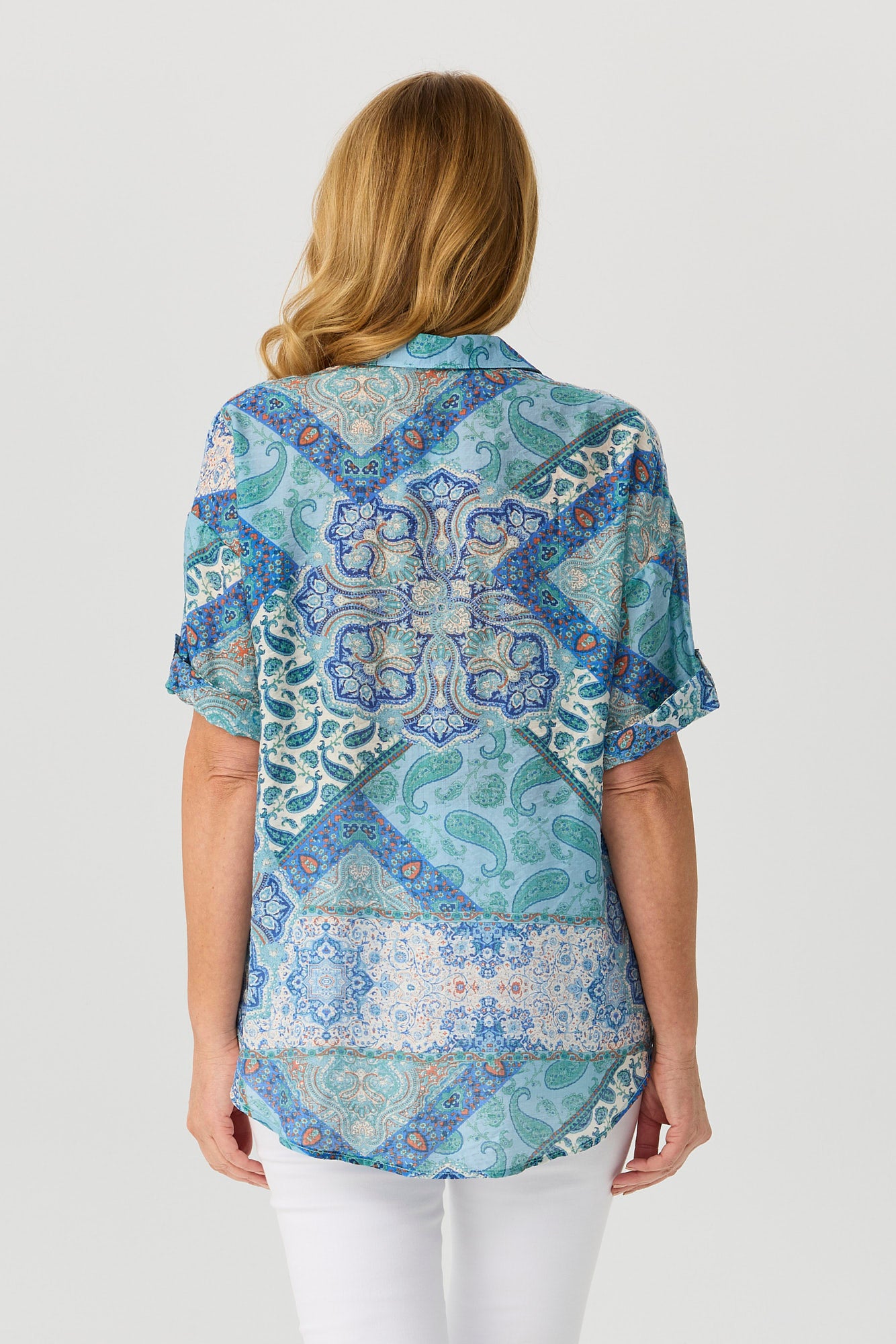 Step into relaxed sophistication with the Corfu Skies Relaxed Short Sleeve Shirt in Blue Mix. Showcasing a striking patchwork paisley print, this lightweight shirt offers effortless charm with its soft drape and airy feel. The drop shoulder fit and rolled sleeves with adjustable button tabs lend a laid-back vibe, making it a breezy staple for warm-weather style.