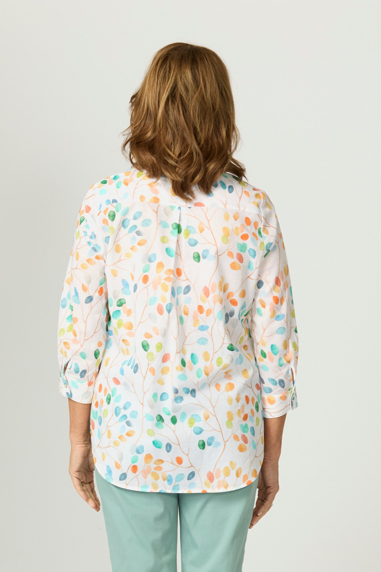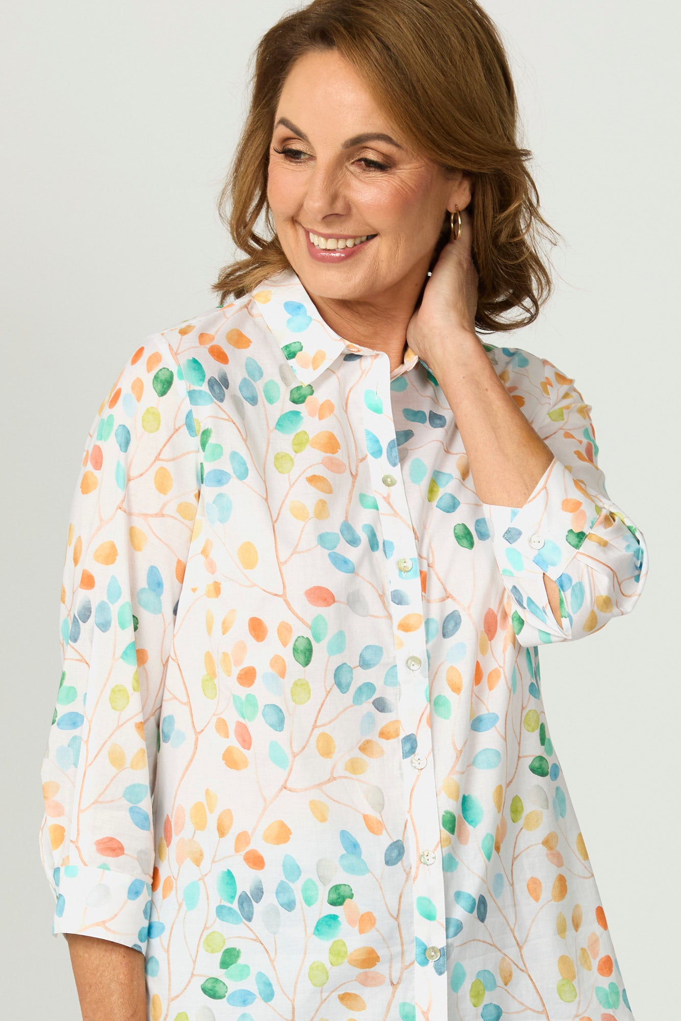 The design features a playful multicolour leaf print on a crisp white base, creating a lively yet sophisticated look. The classic button-through front and collared neckline add timeless appeal, while the 3/4 length sleeves with subtle cuff detail make it versatile for layering or wearing on its own.