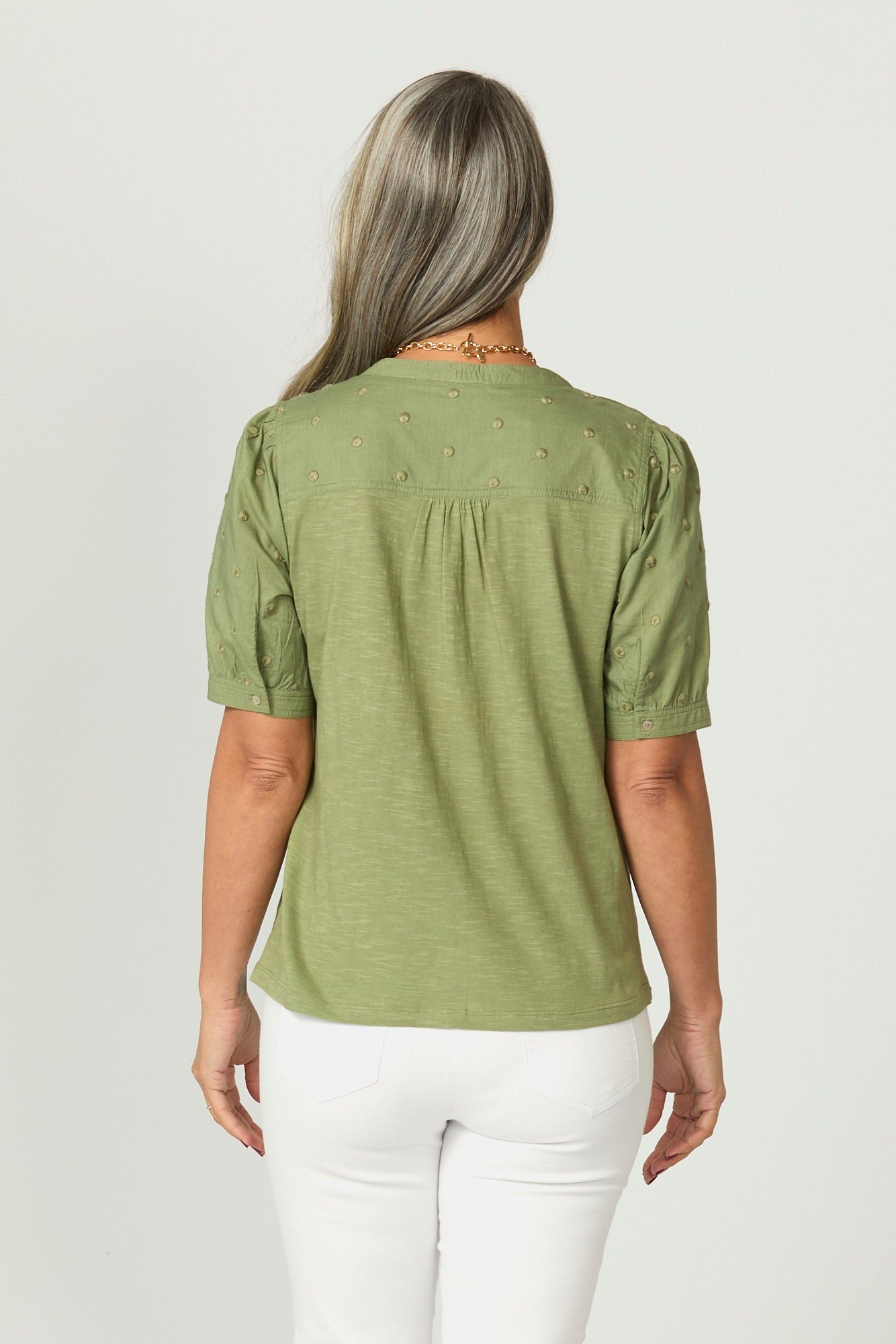 Add a pop of playful charm with the Estancia Puff Sleeve Tee in Olive. This vibrant tee combines eye-catching polkadot contrast panels with feminine detailing, making it a standout piece for everyday wear. The open shoulder and yoke design, paired with a soft V placket and cuffed sleeves, brings a fresh twist to a classic silhouette.