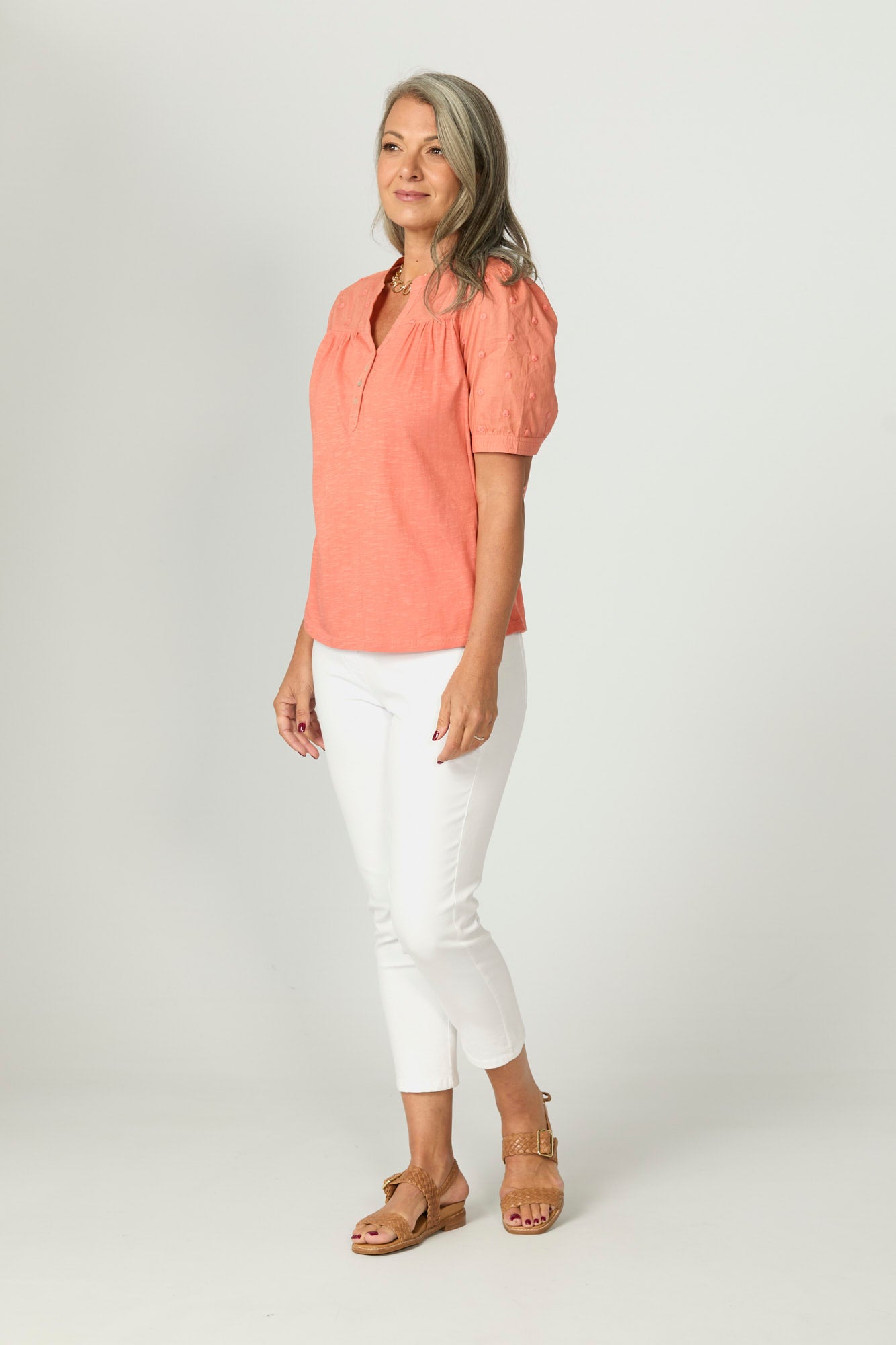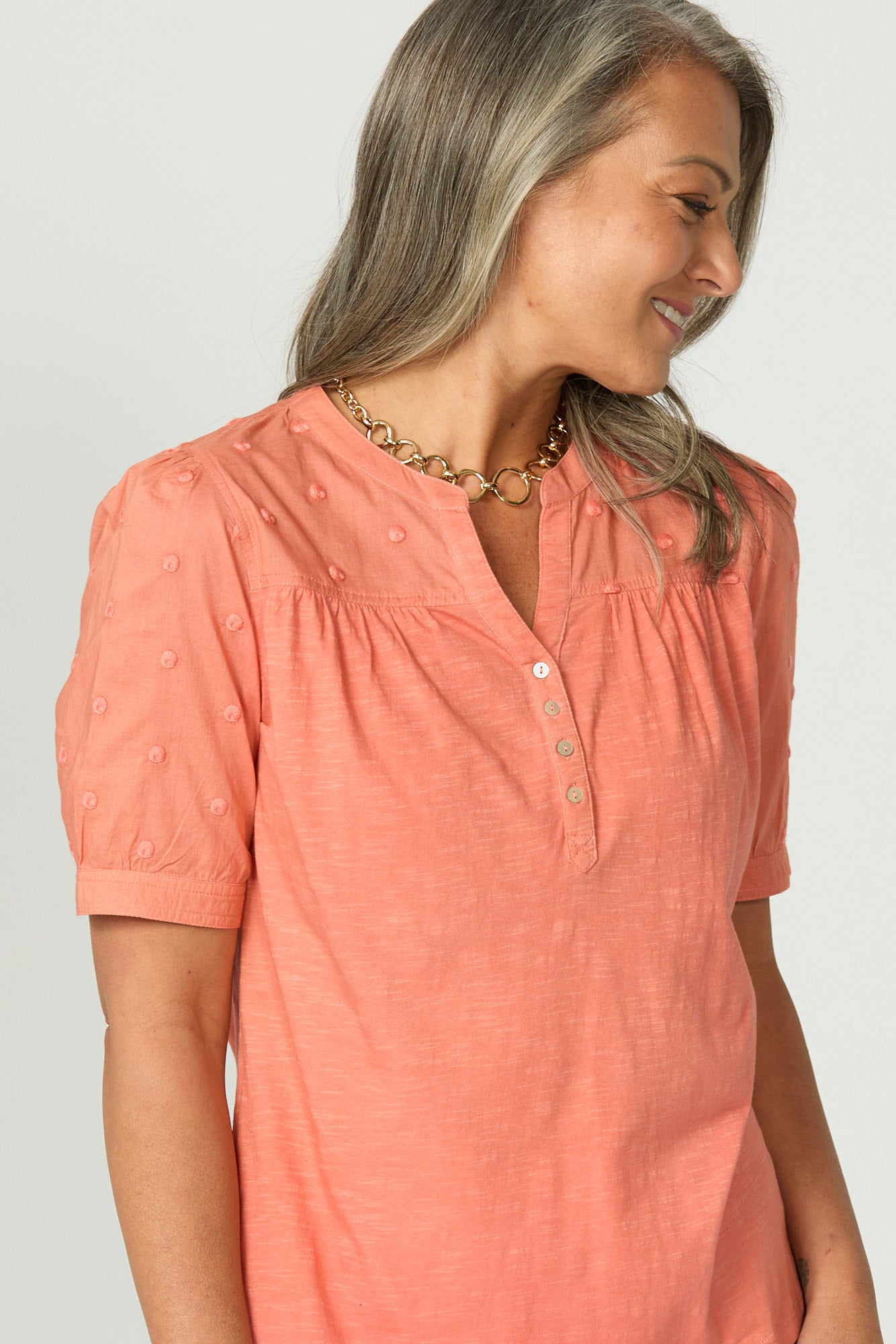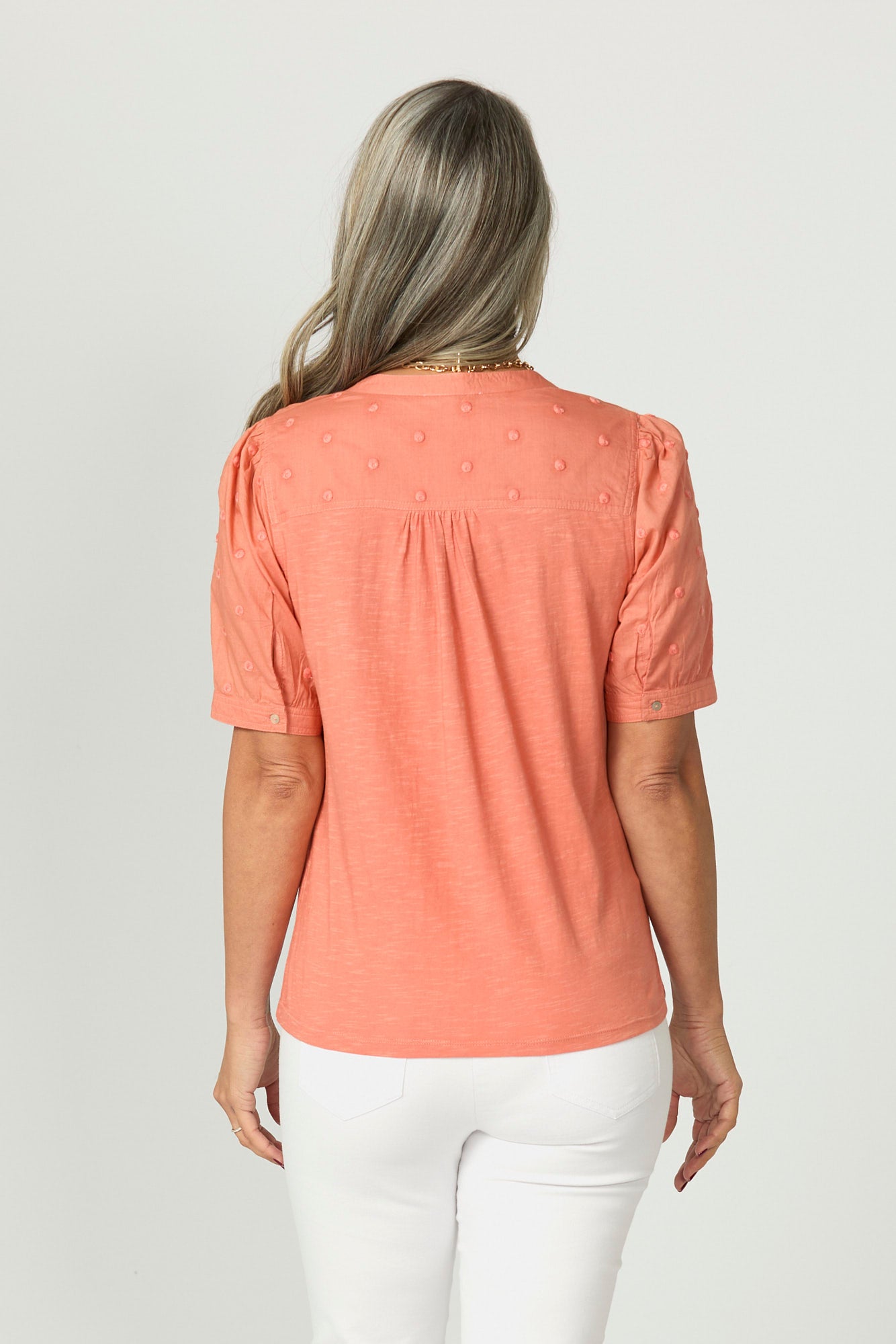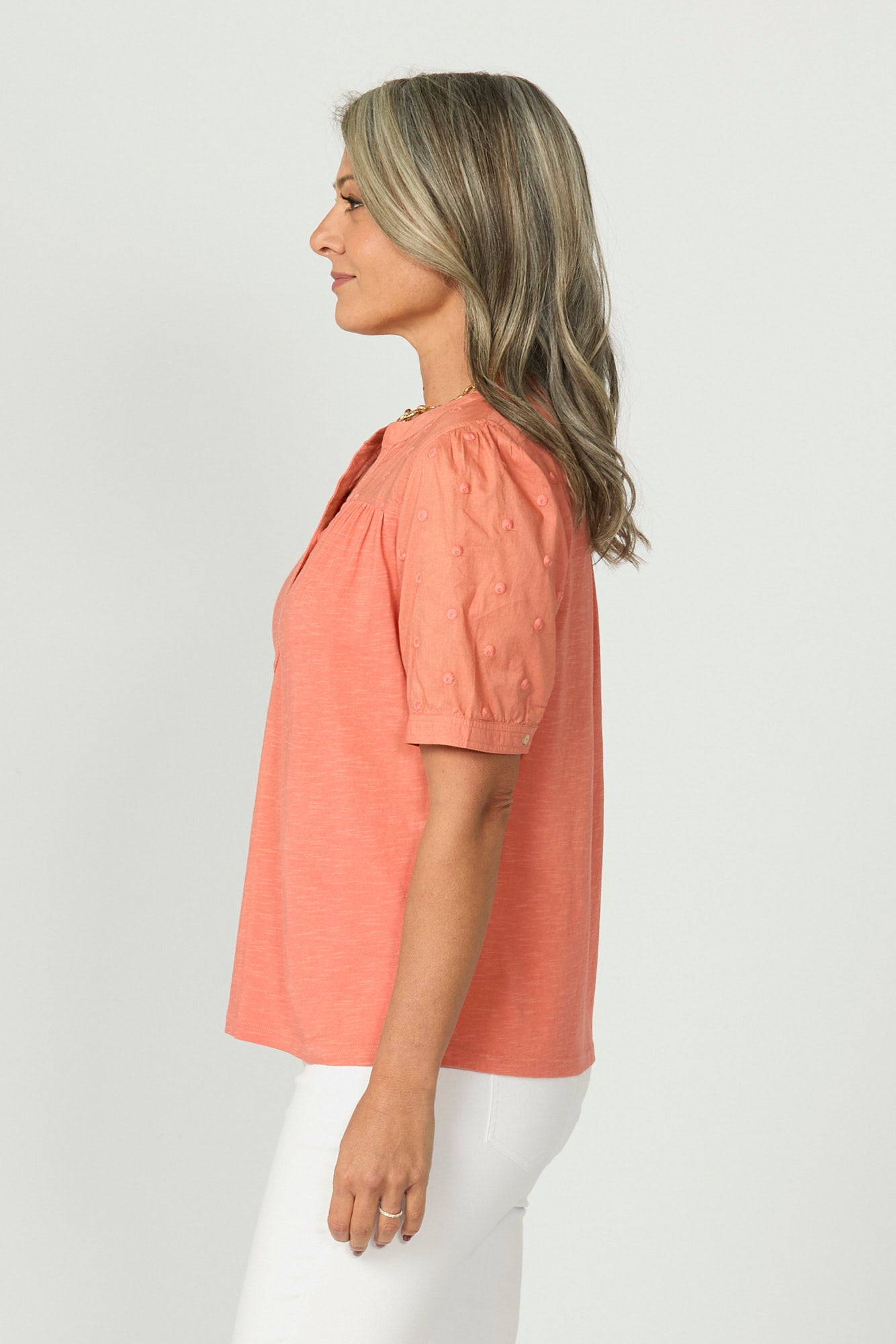 Add a pop of playful charm with the Estancia Puff Sleeve Tee in Papaya. This vibrant tee combines eye-catching polkadot contrast panels with feminine detailing, making it a standout piece for everyday wear. The open shoulder and yoke design, paired with a soft V placket and cuffed sleeves, brings a fresh twist to a classic silhouette.