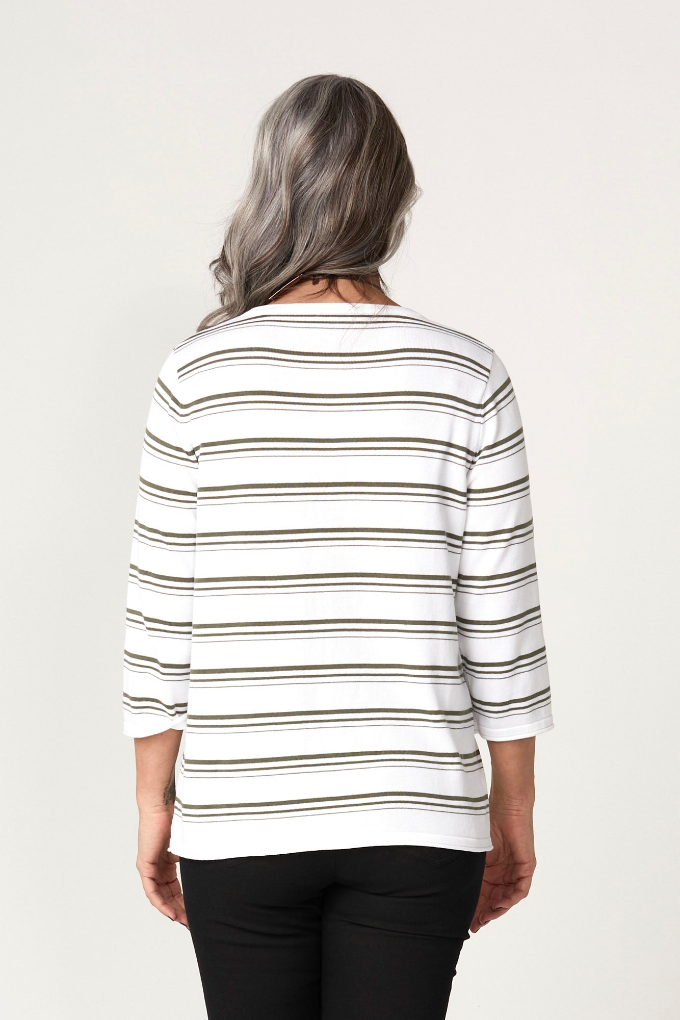 The Felix Stripe 3/4 Sleeve Sweater in White/Olive is a sweater that delivers all-day comfort for warm-weather days. Cotton fabric feels breathable, keeping the sweater comfortable against the skin during long wear. Cuffed sleeves add a neat finish and keep the sleeve line in place. The stripe detail adds visual interest while keeping the overall shape easy to style.