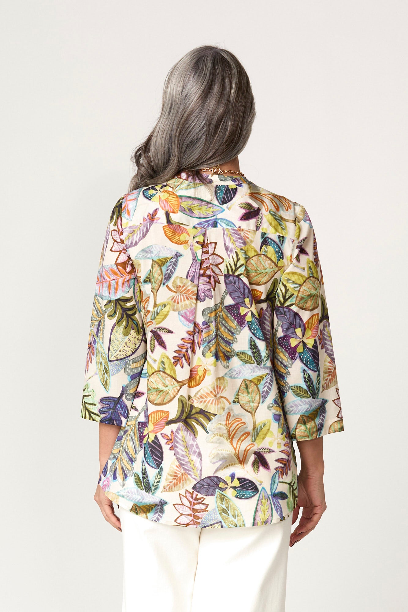 The Foliage 3/4 Sleeve Collarless Shirt in Multi is a shirt that delivers all-day comfort for warm-weather days. Cotton fabric feels soft and breathable, keeping the shirt comfortable against the skin during long wear. A collared neckline adds a clean, structured finish and keeps the upper line neat. 3/4 sleeves give coverage without feeling heavy, working well when you want a lighter sleeve length.