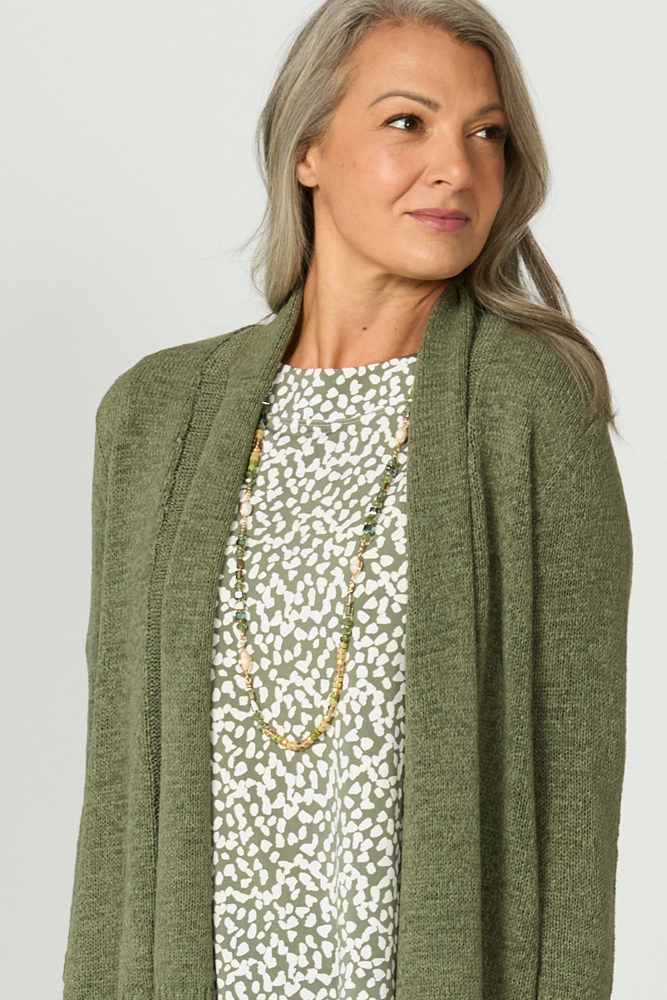 Layer with ease in the Fremantle E2E Tape Yarn Cardi in Olive. This relaxed-fit cardigan features a breathable tape yarn knit that offers texture and style in equal measure. With its open edge-to-edge front and comfortable 3/4 sleeves, it's the perfect lightweight layer for effortless dressing.