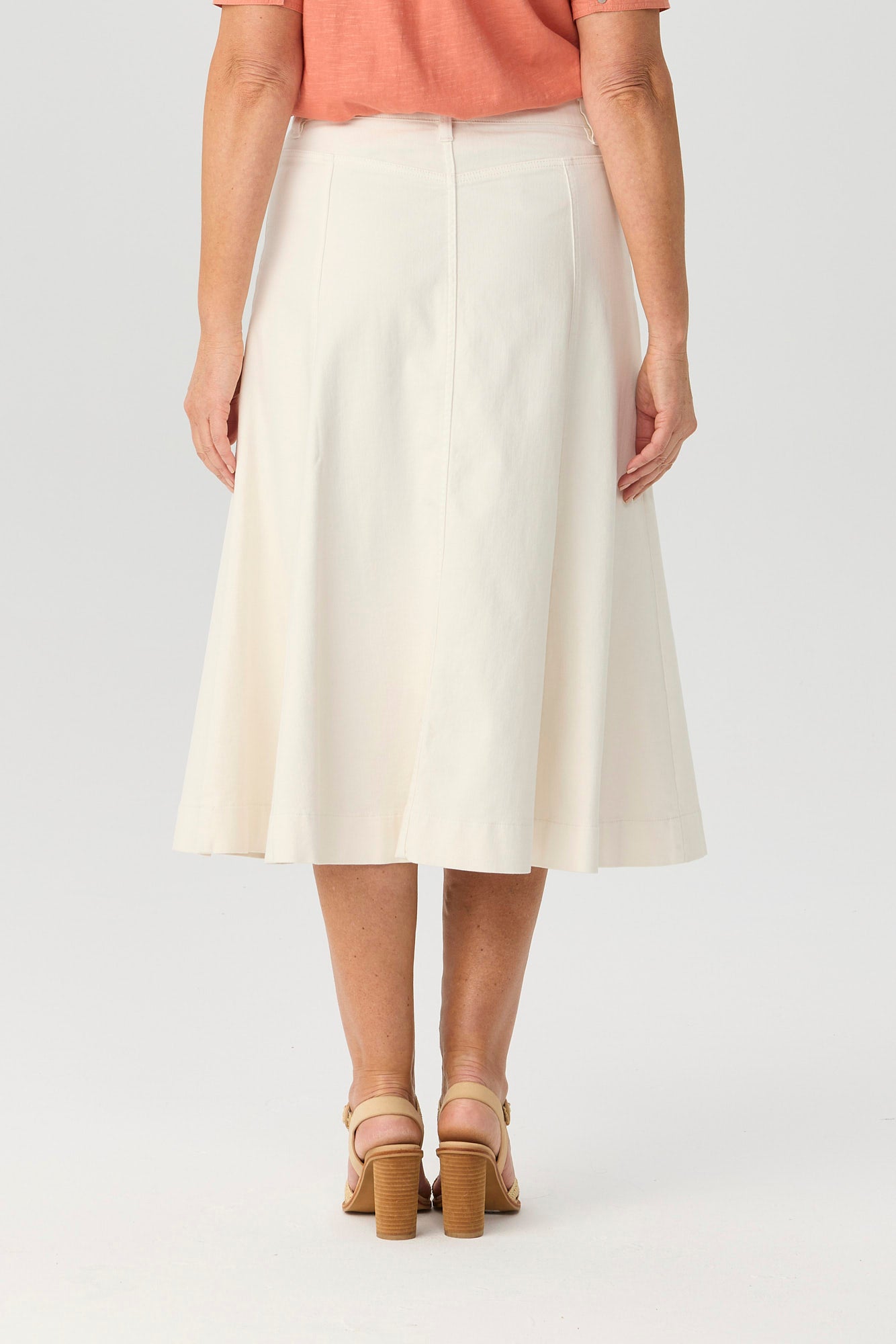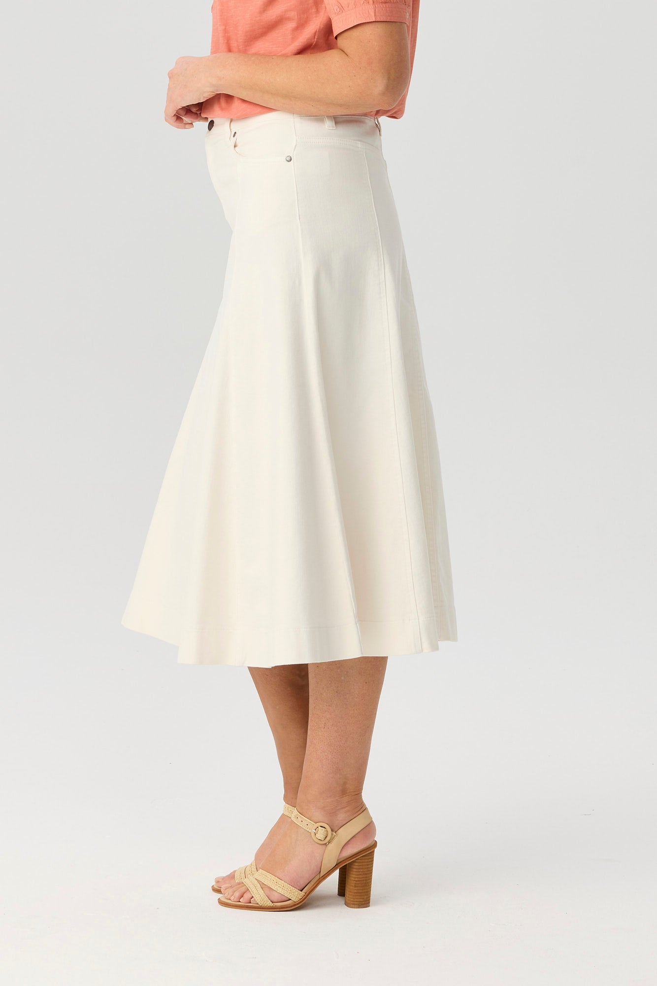 Step into casual chic with the Gored Denim Skirt in Ecru. This A-line denim skirt brings timeless style with a modern twist, featuring topstitch detailing and a flattering silhouette. Designed with functional touches like a shank button waist closure and rivet-accented front curved pockets, it’s a versatile essential for everyday wear.
