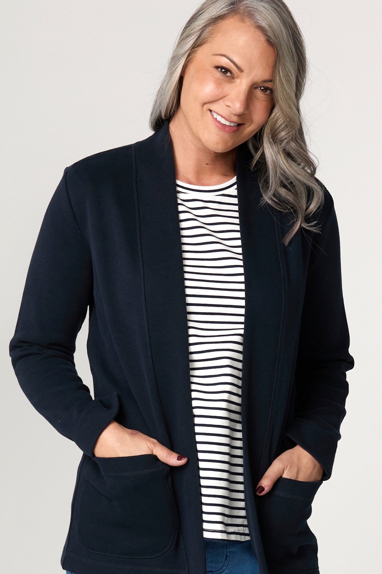 The Haven Edge To Edge Cardigan in Navy is a cardigan that delivers all-day comfort for cooler-weather layering. Long sleeves add extra coverage and make the piece useful when the weather turns cooler. Pockets keep small essentials close and reduce the need for a bag when you are on the move. The build supports easy layering, making it practical for changing temperatures and indoor-to-outdoor wear.