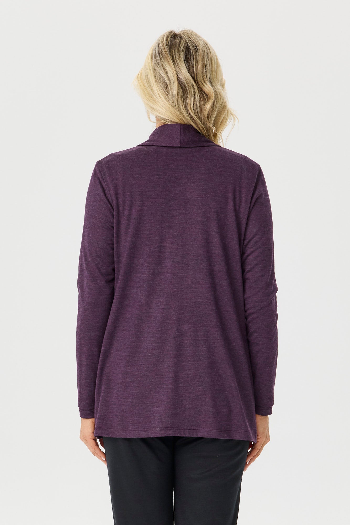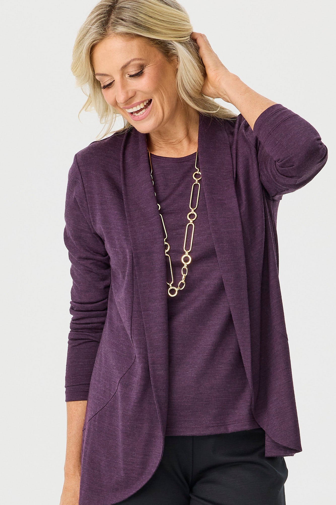 Refine your wardrobe with the Hedrena Jersey Curved Hem Cardigan in Raisin, a beautifully contoured piece made from 100% Australian Merino Wool. Crafted locally in Australia, this soft jersey knit offers a flattering fit and timeless elegance. The shawl collar and curved front hem add a gentle flow to your silhouette, making it an ideal layering essential for cooler days.