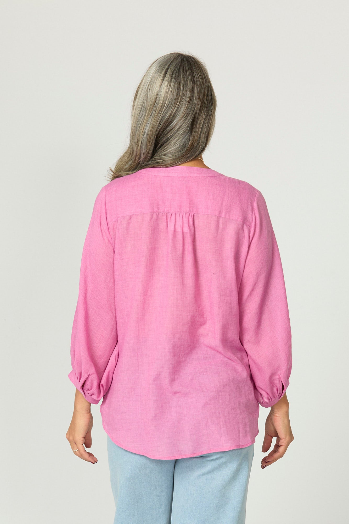 Designed with a relaxed silhouette, this style showcases subtle puff sleeves finished with gentle gathering at the cuff, adding shape without bulk. The button-through front and soft V-neckline create a flattering, easy-to-wear look, while the hi-low curved hem offers coverage and styling versatility.
