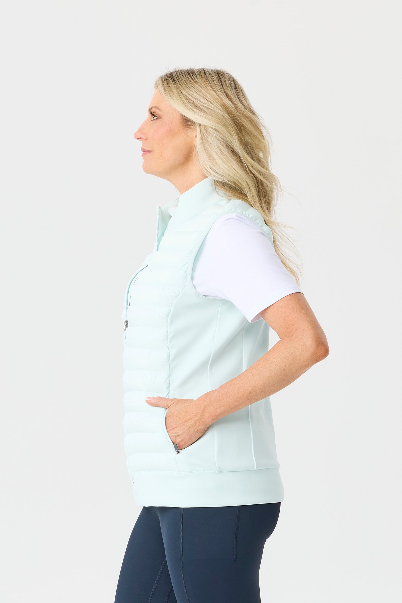 The Hybrid Quilted Zip Vest in Mint is a item that delivers lightweight comfort for warm-weather days. The fabric feels lightweight, keeping the item comfortable against the skin during long wear. A collared neckline adds a clean, structured finish and keeps the upper line neat. Pockets keep small essentials close and reduce the need for a bag when you are on the move.