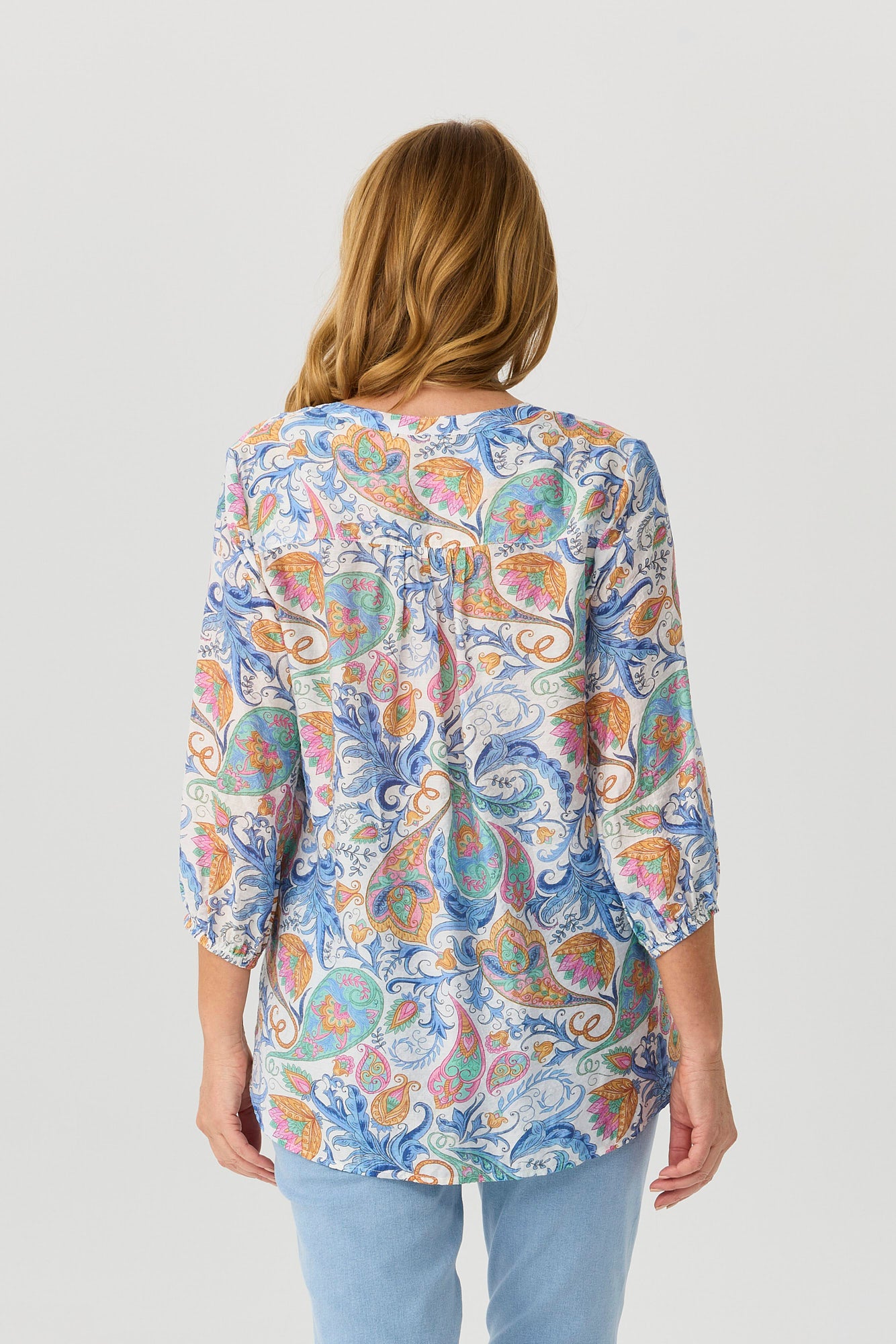 Add a burst of colour to your wardrobe with the La Fiesta 3/4 Sleeve Soft Blouse in Multi. Featuring a vibrant paisley print on a lightweight, flowy fabric, this blouse is all about relaxed elegance. The blouson sleeves and curved hi-low hem create a graceful silhouette perfect for day-to-night styling.