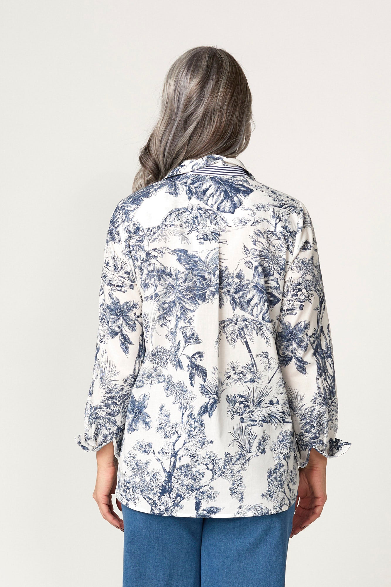 The print detail adds visual interest while keeping the overall shape easy to style. A button-down front keeps the look classic and makes the piece easy to wear open or closed. A curved hem adds coverage at the back and softens the line for an easy finish. The overall cut makes it easy to wear on its own or under a light layer when temperatures shift.