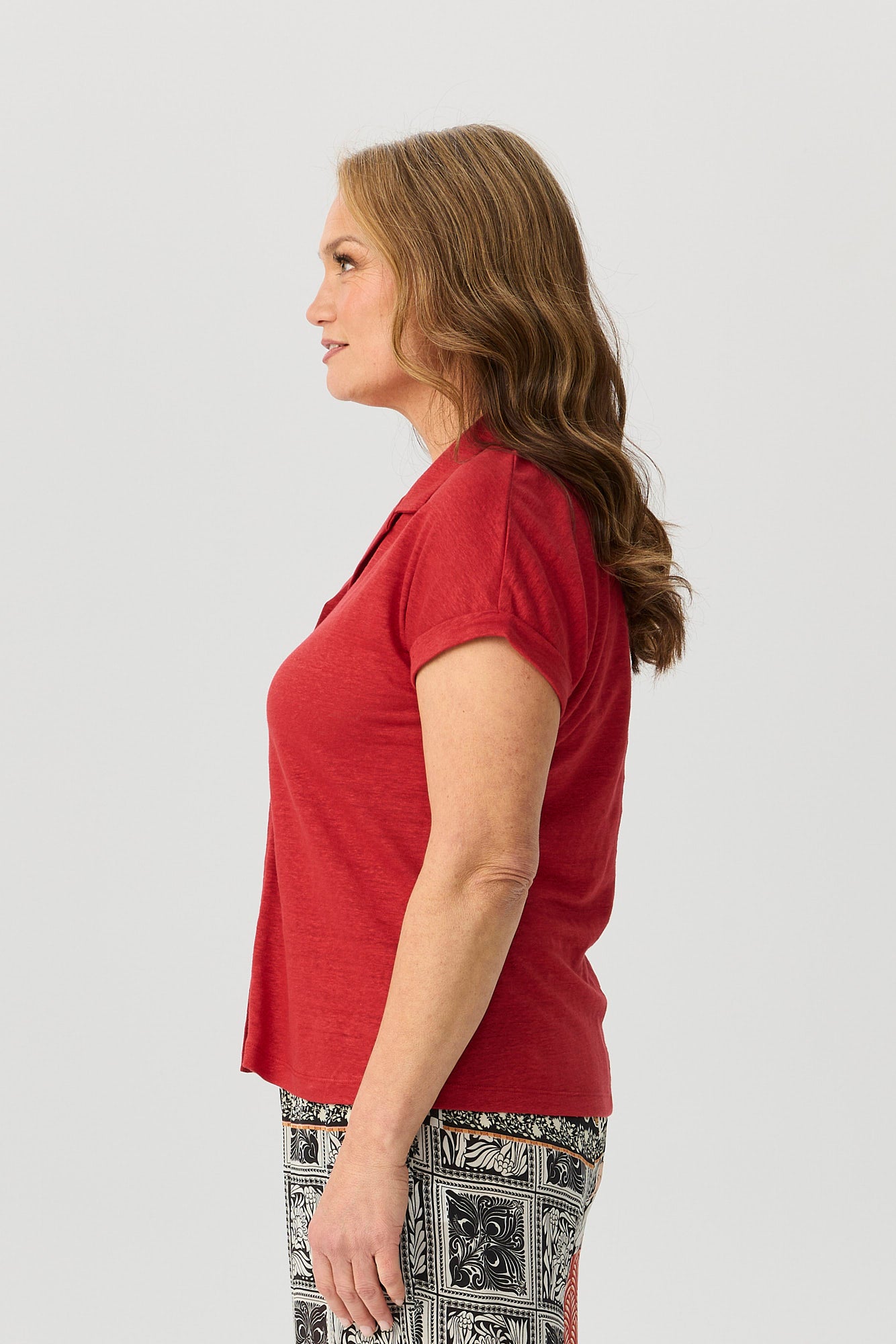 Step into effortless style with the Lia Luxton S/S Button Thru Top in Brick. Crafted from a luxe linen blend jersey, this piece blends breathable comfort with everyday elegance. The collared neckline and button-down front offer timeless structure, while drop shoulder capped sleeves add a relaxed, modern silhouette perfect for versatile styling.