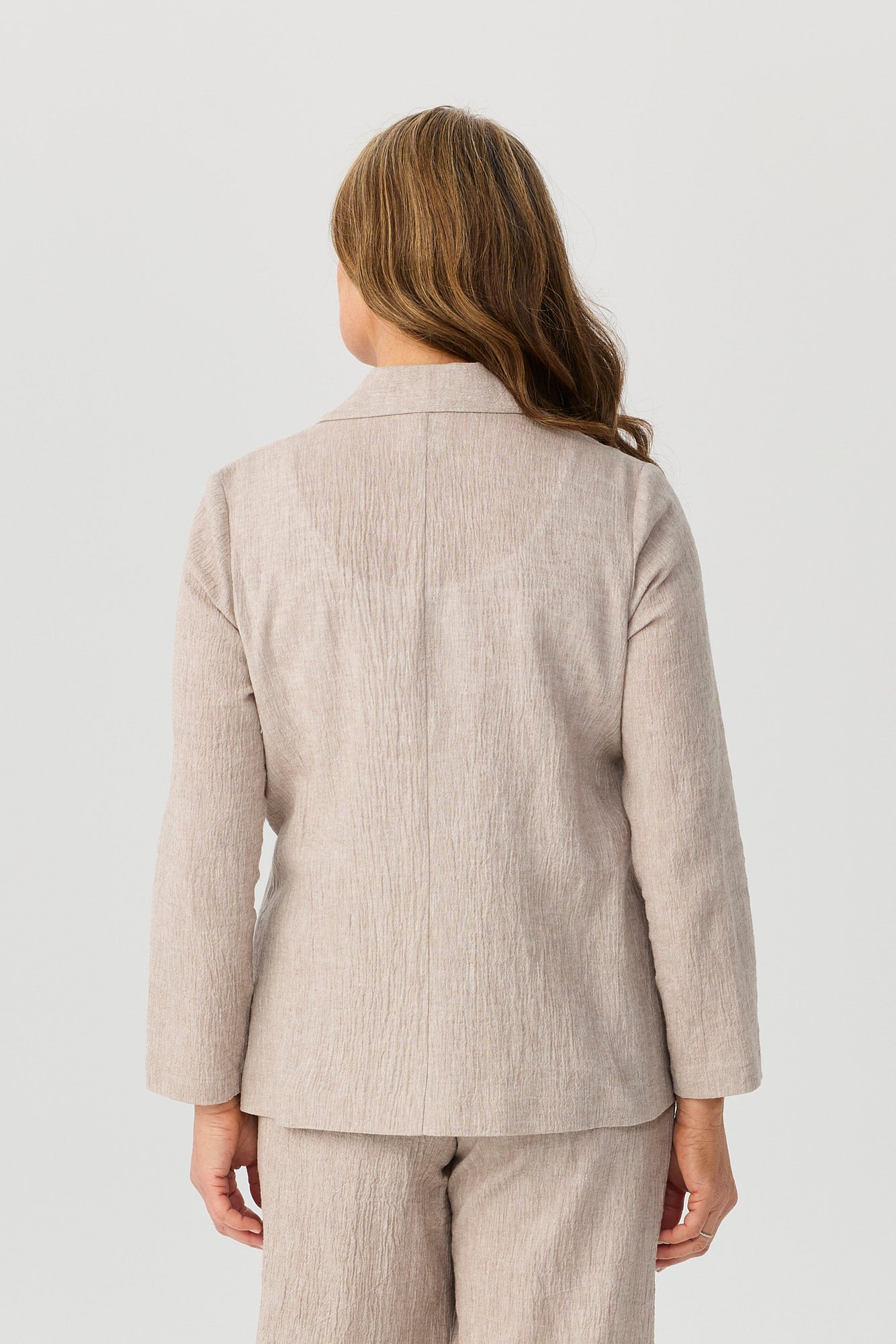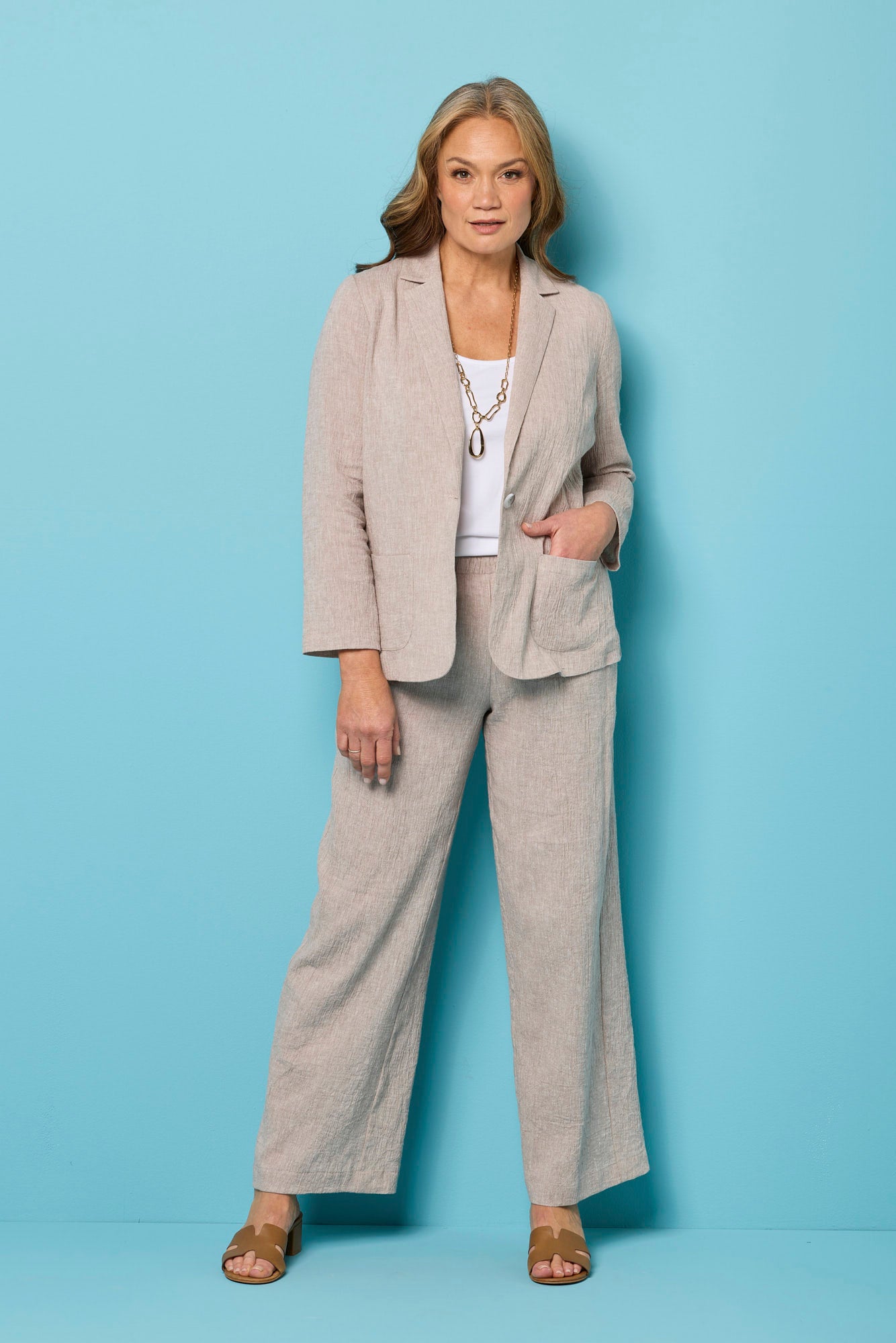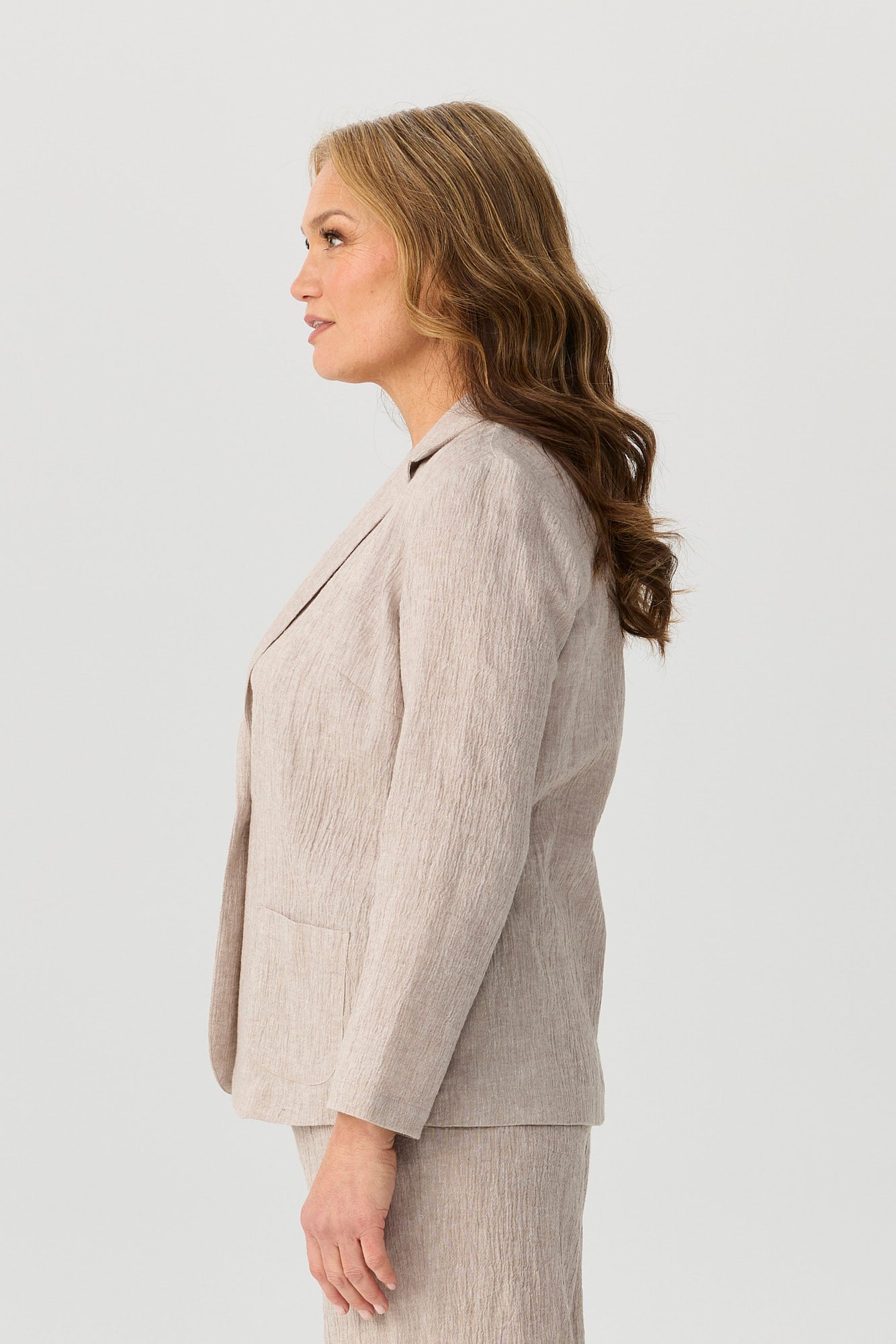 Step into effortless sophistication with the Lumina 1 Button Jacket in Oatmeal. Made in Australia from a classic textured linen-cotton blend, this longline piece offers refined structure with breezy comfort. Its flattering A-line fit, 3/4 sleeves and side hem splits lend a touch of contemporary charm, perfect for layering throughout the seasons.