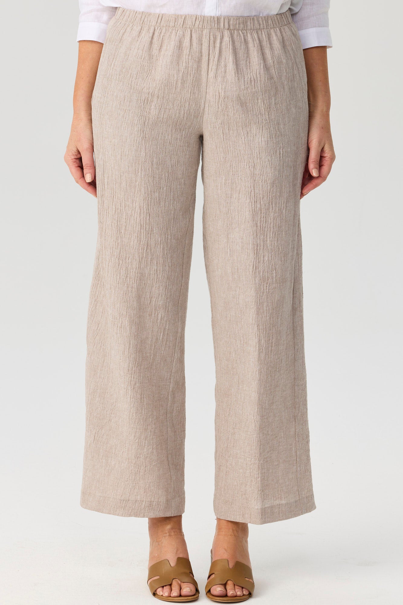 Step into comfort and sophistication with the Lumina Wide Leg Pull On Pant in Oatmeal. Made in Australia, these pants feature a lightweight textured fabric and an easy pull-on design. The wide-leg silhouette offers flow and ease, while the elasticated waist and inner side pockets ensure all-day wearability.