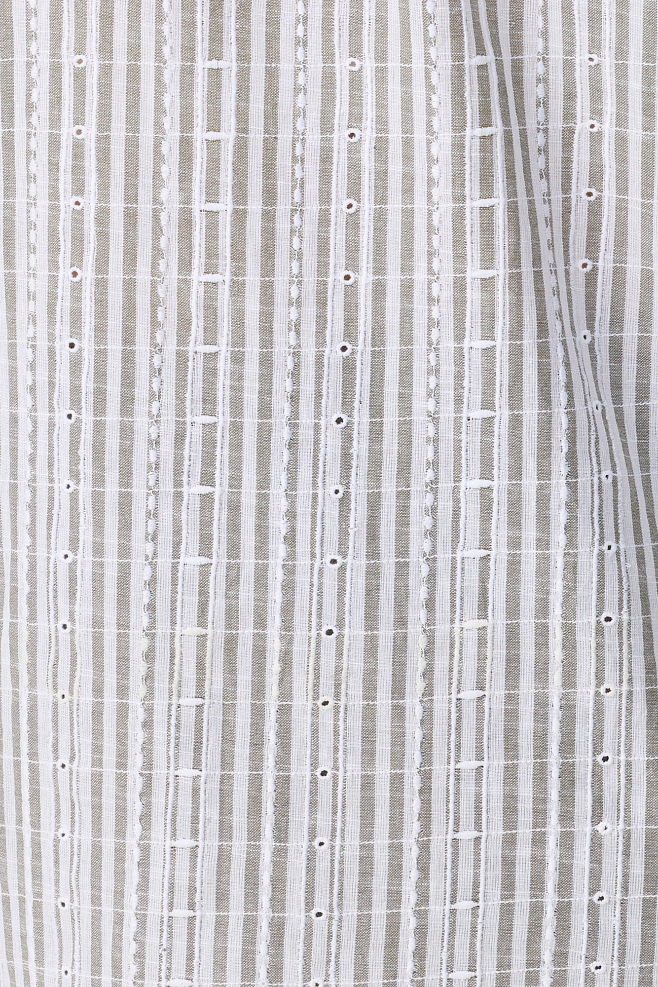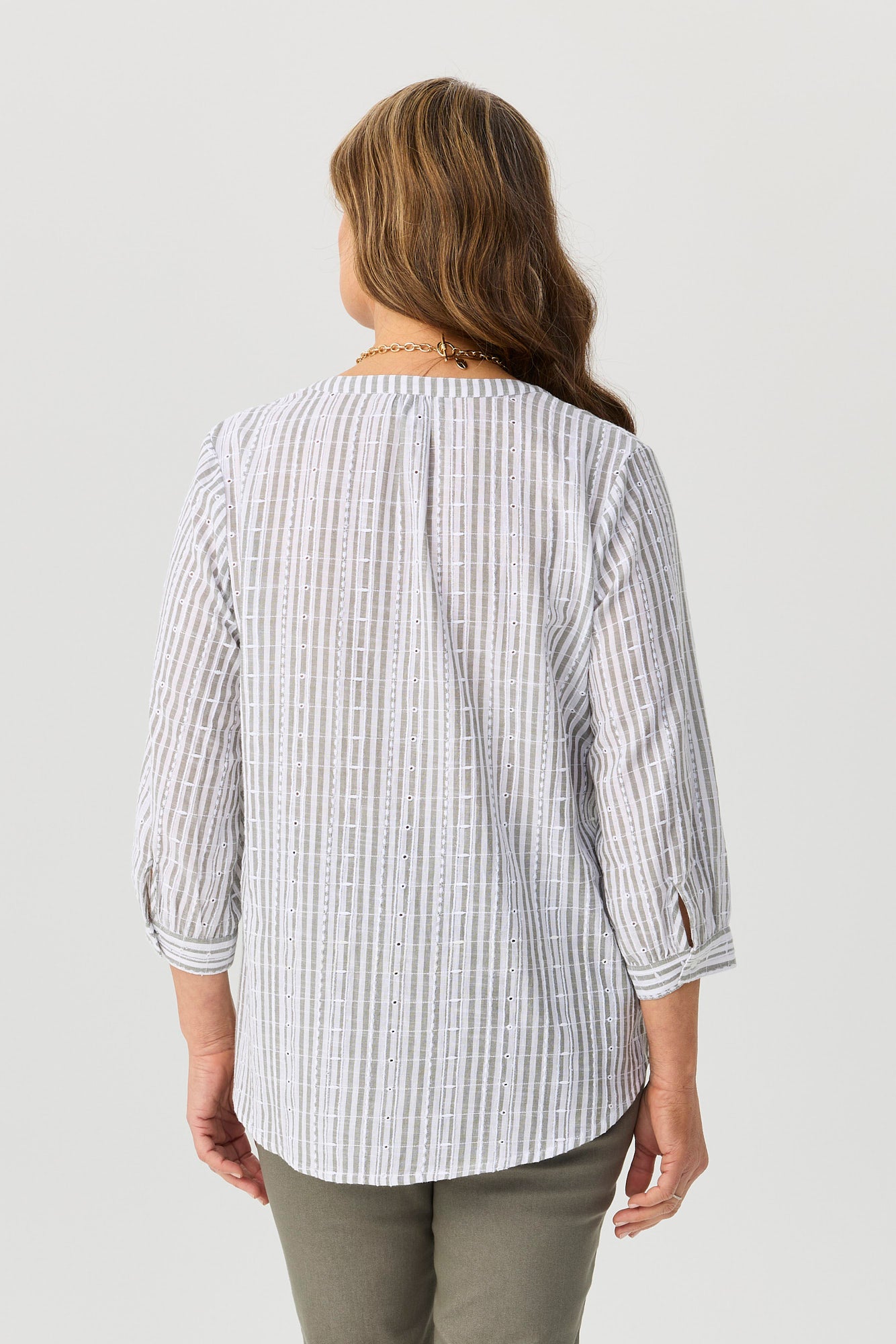 Add a touch of refined elegance to your wardrobe with the Mondello Stripe Collarless Shirt in Olive. Crafted from pure cotton, this yarn-dyed striped shirt features delicate embroidery for a stylish finish. The V neck insert and slight gathering at the center back neck enhance its feminine appeal, while the cuffed 3/4 sleeves with gathering and button-down front create a relaxed yet polished look.