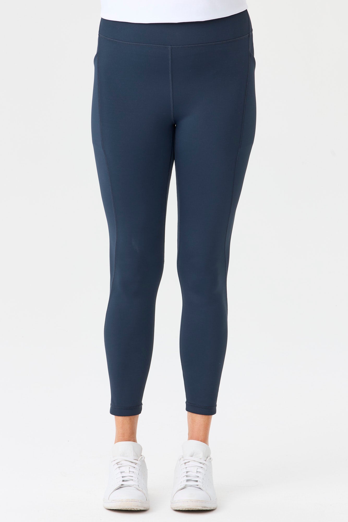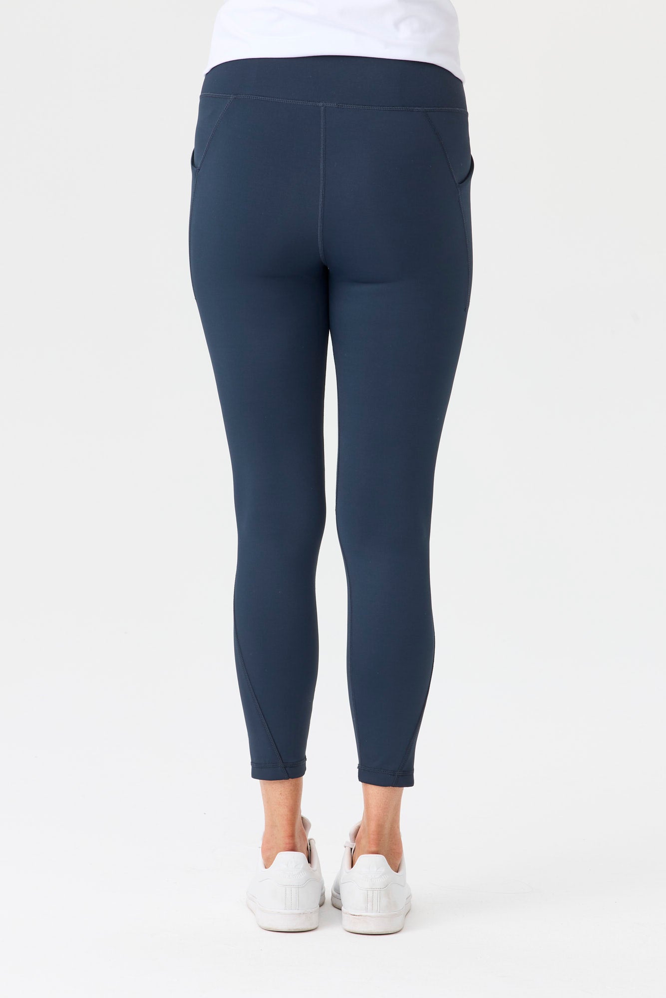 The On The Go Pocket Legging in Navy is a item that delivers all-day comfort for daily routines. The cropped length keeps the hem light and shows the ankle, which suits warmer days and easy styling. Pockets keep small essentials close and reduce the need for a bag when you are on the move. This keeps the piece comfortable to wear for longer stretches without feeling fussy or restrictive.