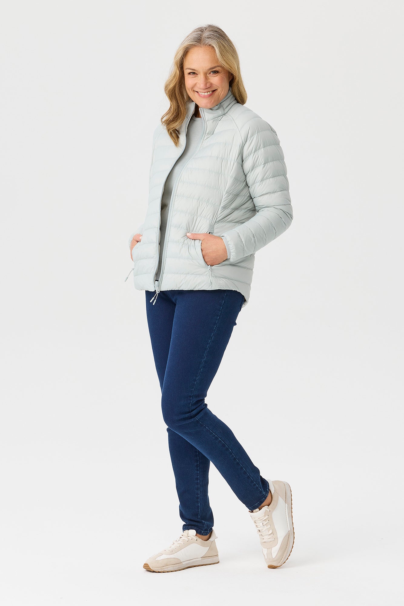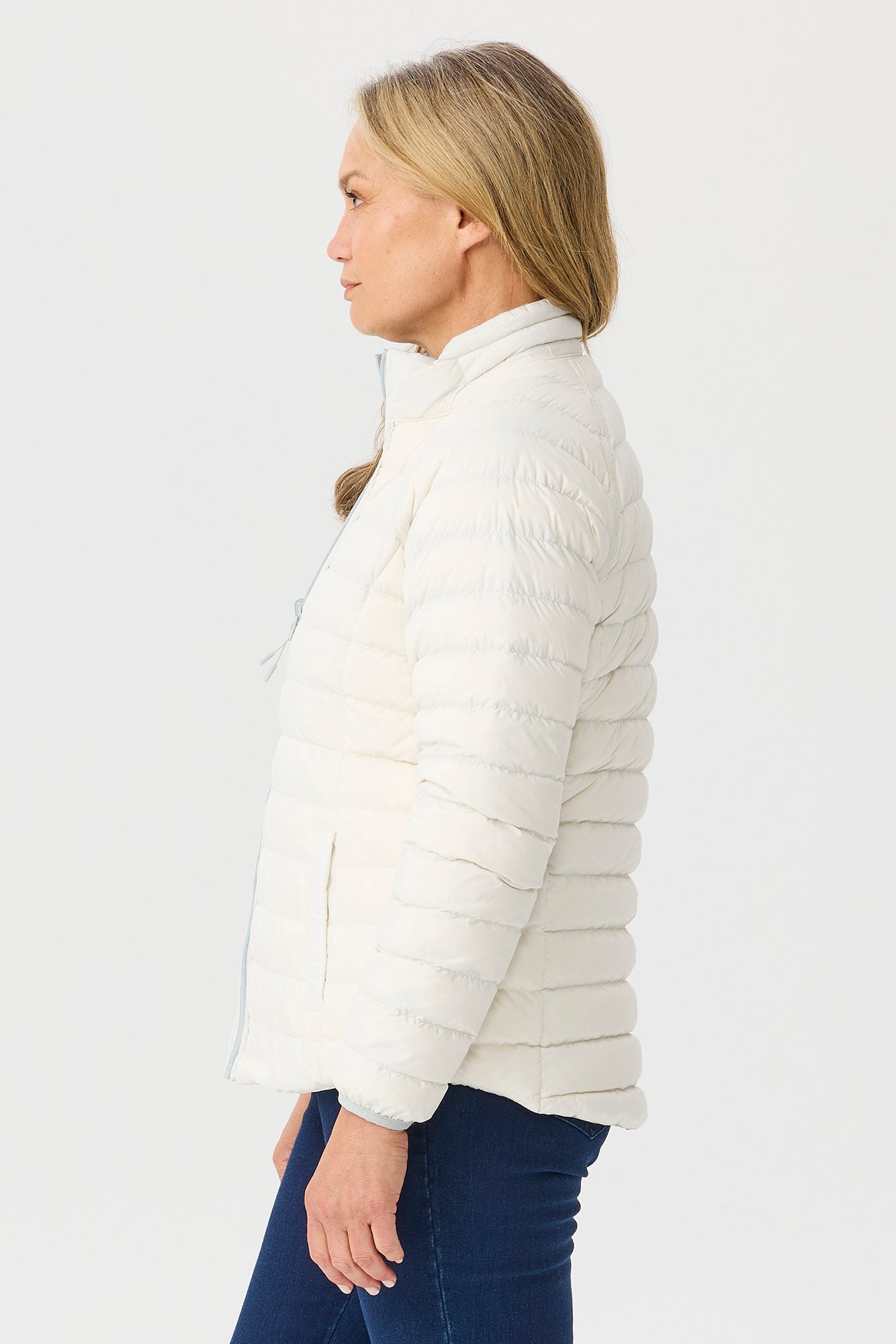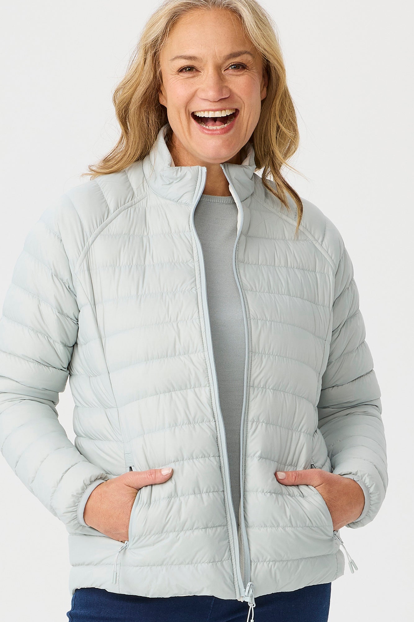 Stay stylish and cozy with the Outdoors Reversible Down Jacket in Mist/Parchment. This quilted puffer jacket features a reversible design, offering two chic looks in one. With a zip-down front, raglan sleeves, and a stand-up collar, it ensures warmth and versatility. The front seams enhance fit, while concealed zip-closure pockets add practicality.