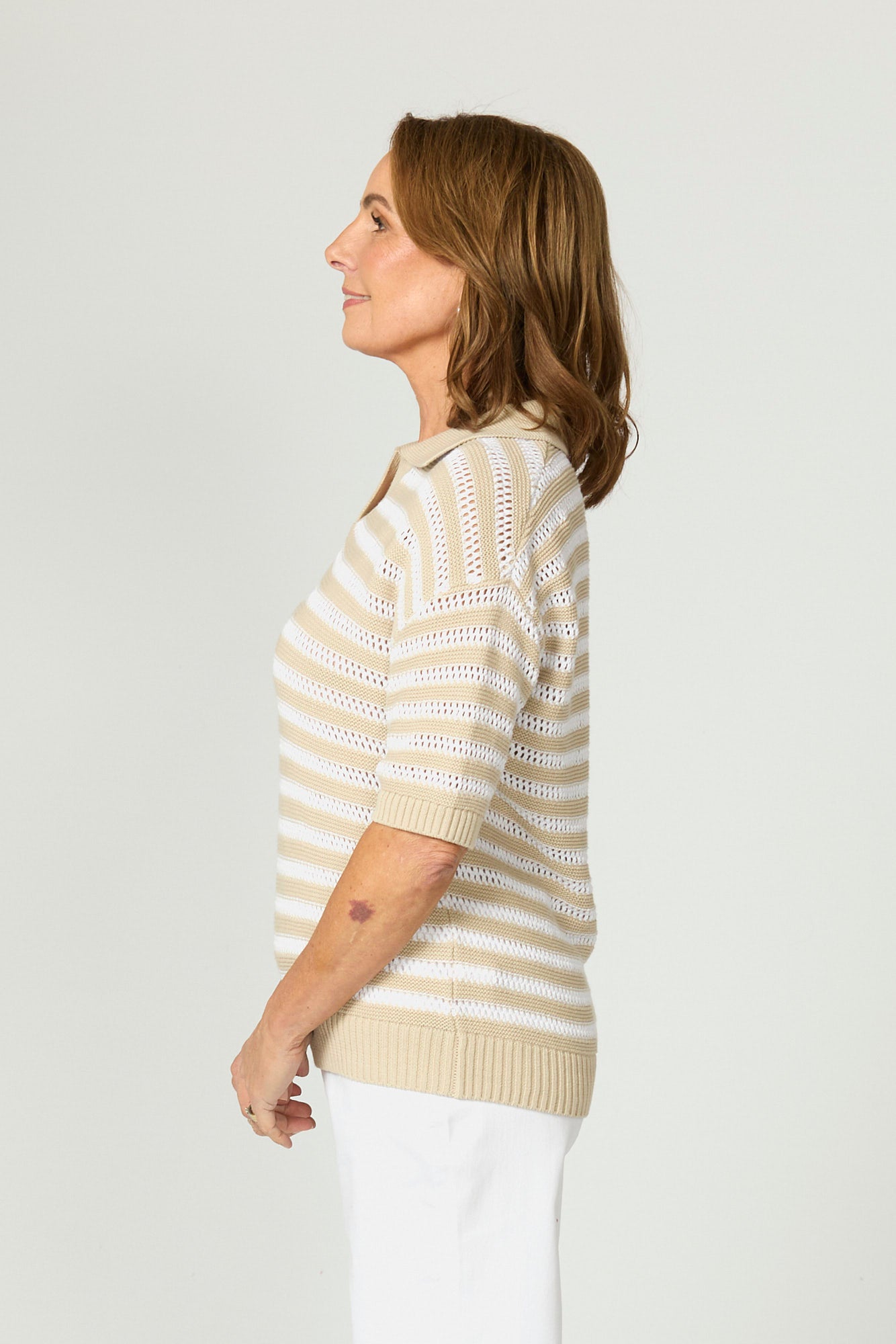 Elevate your casual wardrobe with the Port Fairy Stripe Polo, crafted from soft and breathable 100% cotton knit. This lightweight style features a chic open-weave stripe design in neutral tones, perfect for effortless everyday dressing.