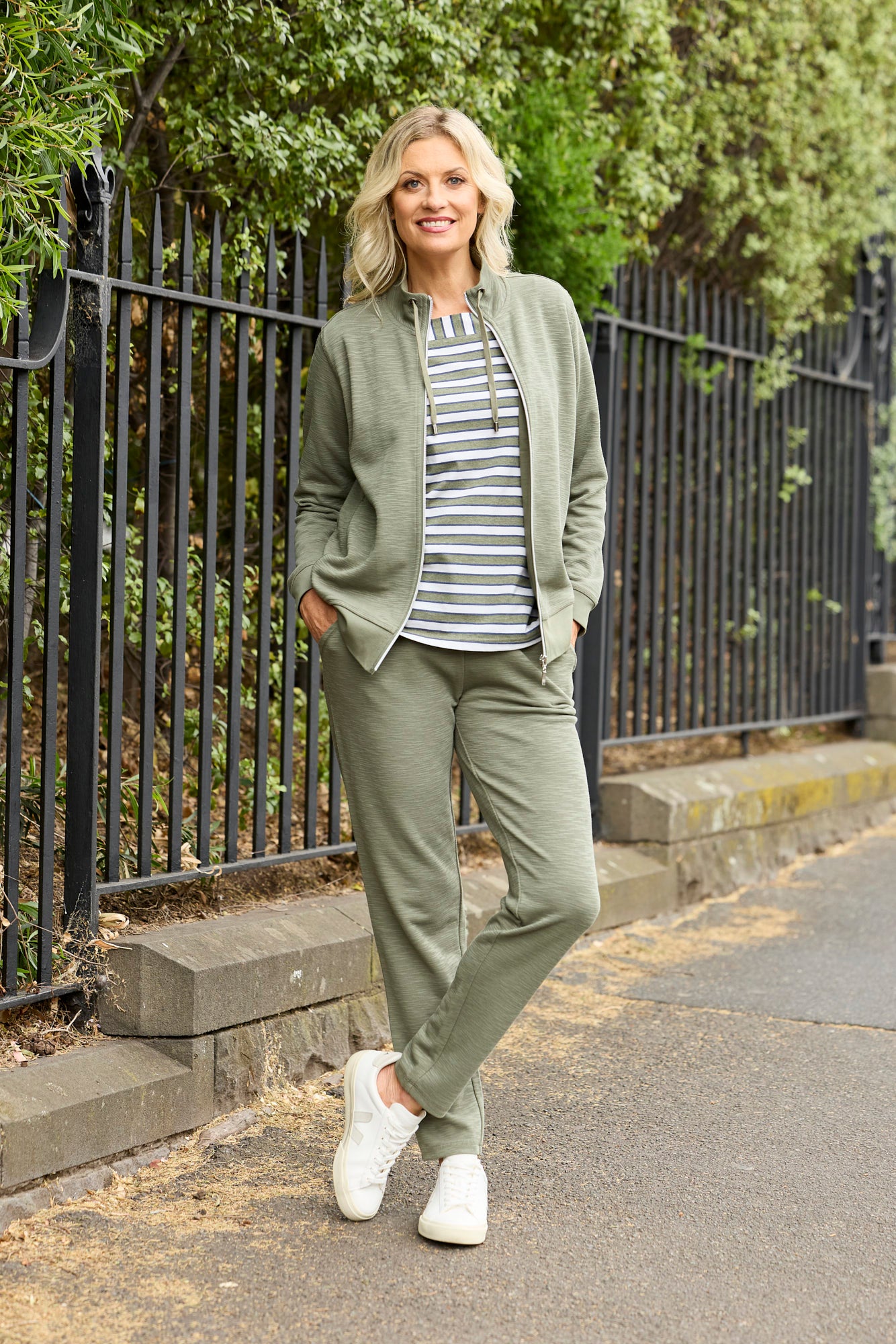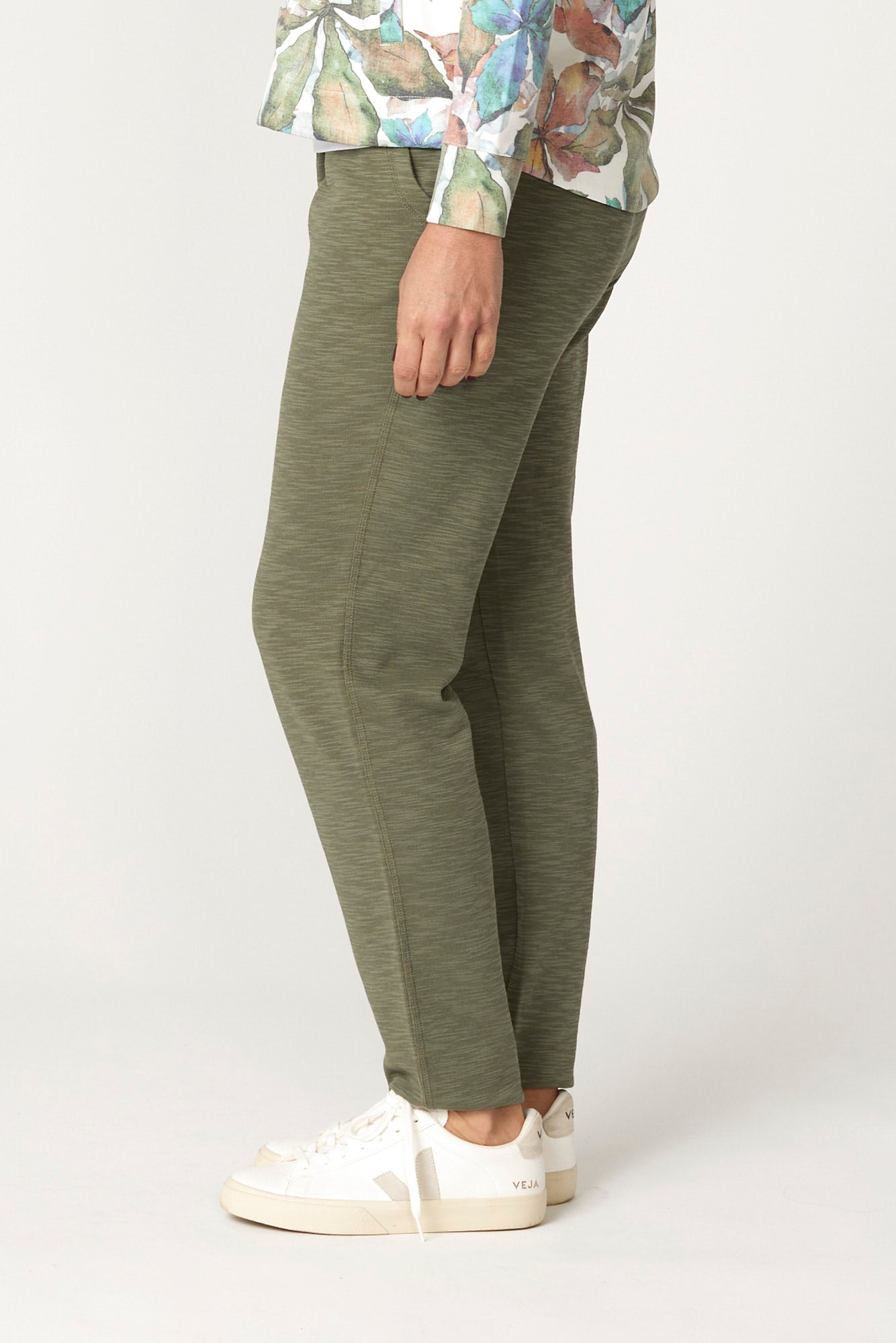 The Retreat Top Stitch Pull On Pant in Olive is a top that delivers easy movement and comfort for daily routines. The fabric feels soft, keeping the top comfortable against the skin during long wear. A tapered leg keeps the ankle line clean while maintaining ease through the upper leg. Stretch through the fabric supports easy movement and helps the fit recover after wear across everyday activity.