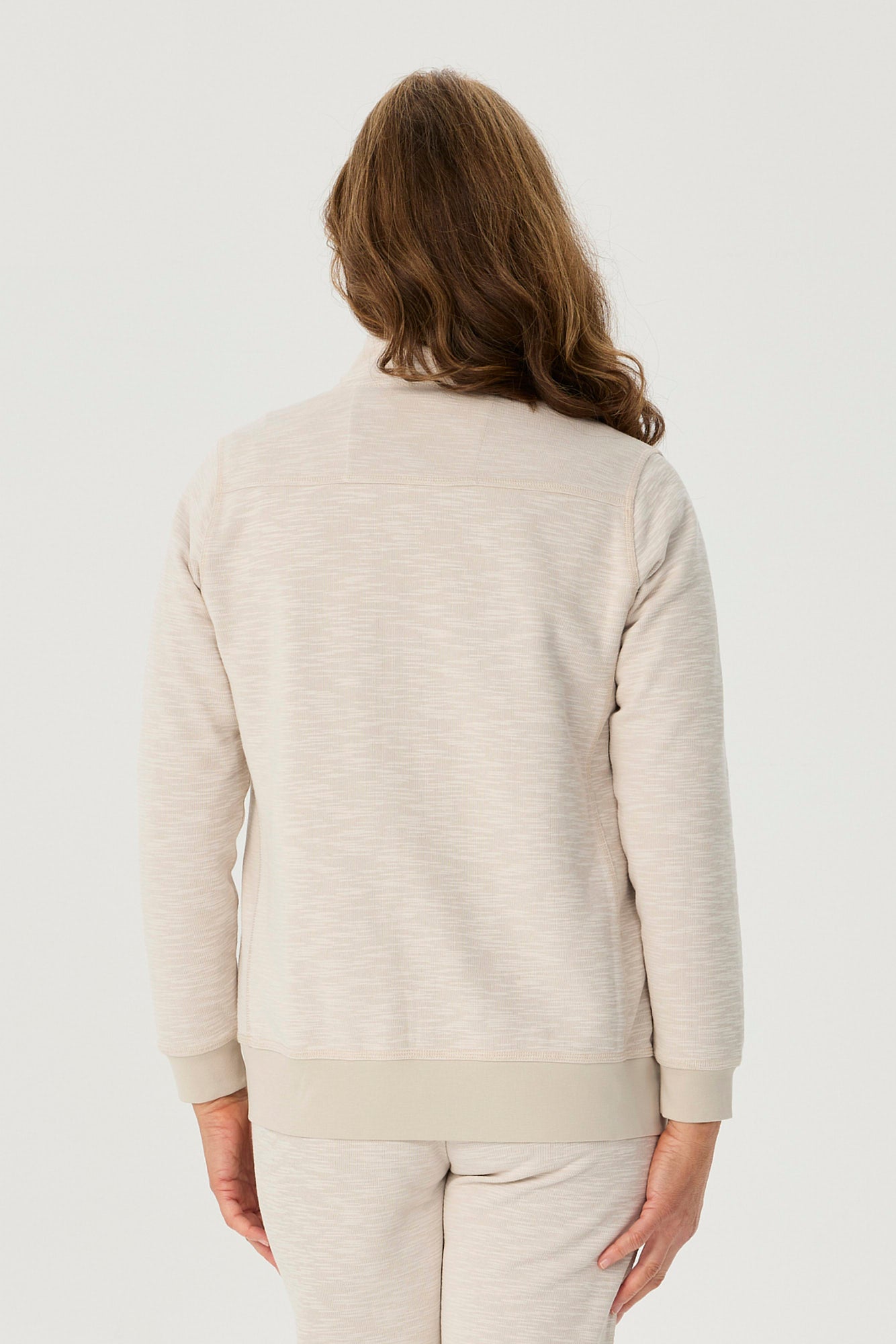 The full zip front with silver-toned hardware and drawstring funnel neck offers adjustable warmth, while ribbed cuffs and hem provide a secure, cosy fit. With side pockets for functionality and a neutral taupe hue that pairs with everything, this versatile piece is ideal for lounging or layering on the go.