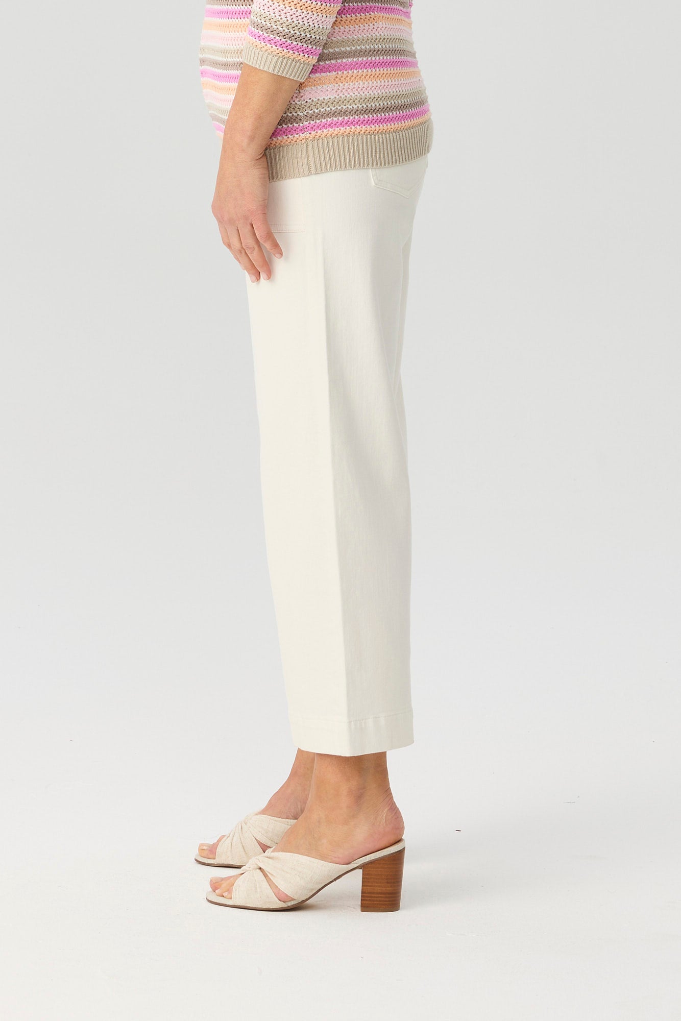 Elevate your everyday denim with the Shelby Patch Pocket Zip Jean in Ecru. Designed for comfort and style, this wide-leg jean features a front shank button and zip closure with side elastic panels for a flexible fit. The patch pockets and topstitch detailing add a modern edge, making it a chic staple for any wardrobe.