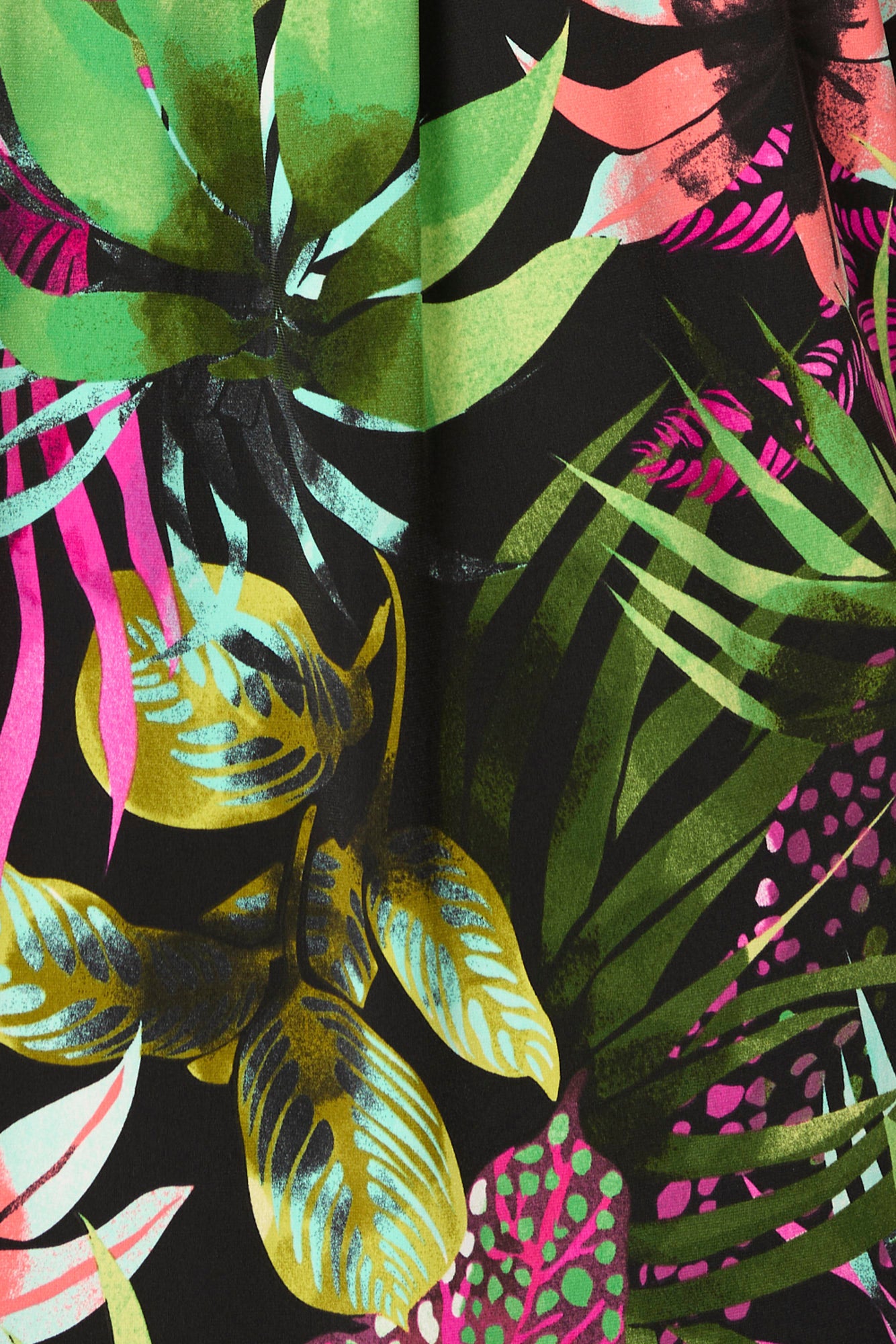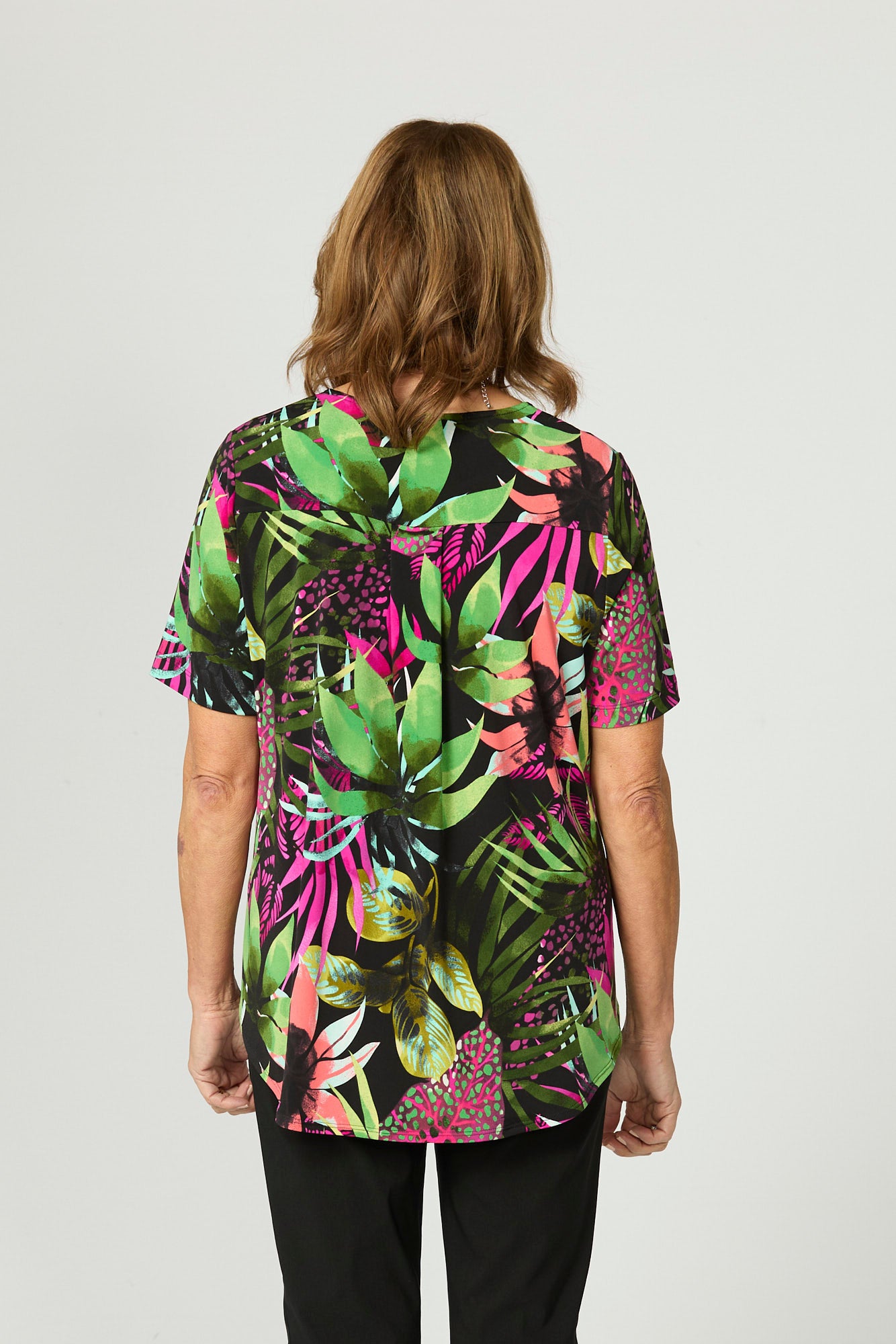 Bring bold energy to your look with the Suva Pleat Back Short Sleeve Top in Black with Brights. Made in Australia, this vibrant tee showcases a colourful tropical botanical print with textured puff detailing. The soft stretch fabric, curved hi-low hem, and pleat back design offer both comfort and stylish movement, making it a standout piece for casual days.
