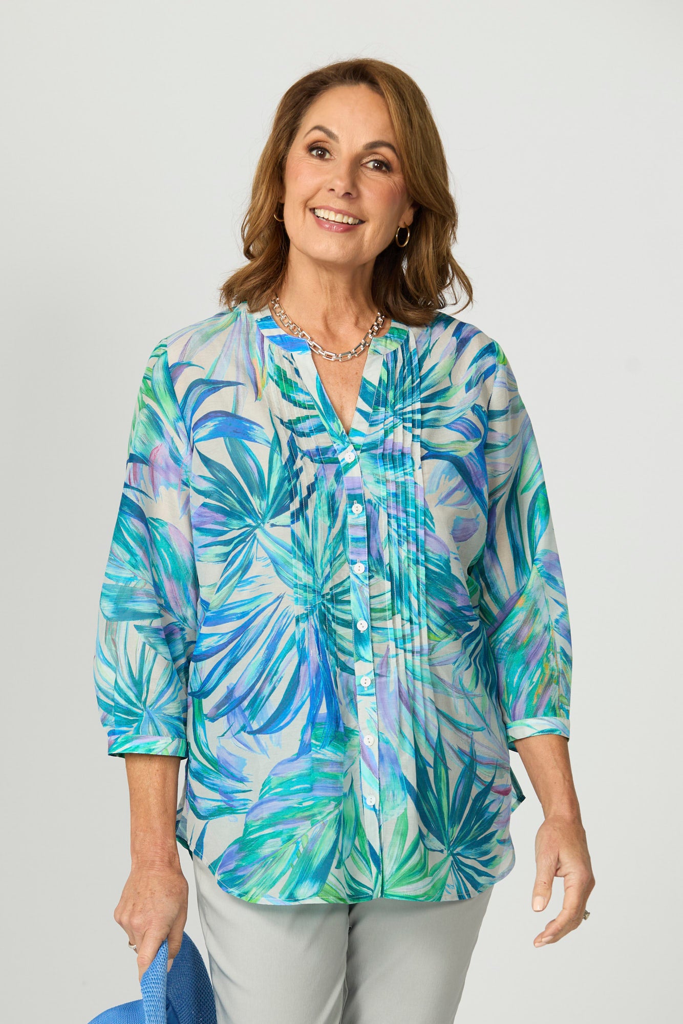 Breeze through the warmer days in effortless style with the Tropical Palms Pintuck Shirt in Multi Blue. This vibrant piece showcases a refreshing leafy print paired with thoughtful pintuck detailing for a touch of structure. The soft, lightweight fabric drapes beautifully, making it an easy choice for casual elegance and comfort. Perfect for relaxed weekends or tropical getaways.