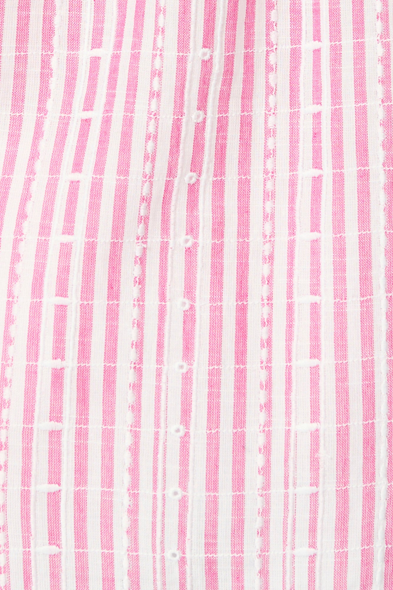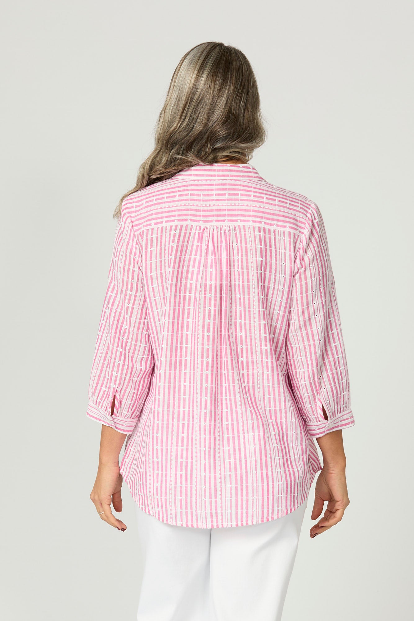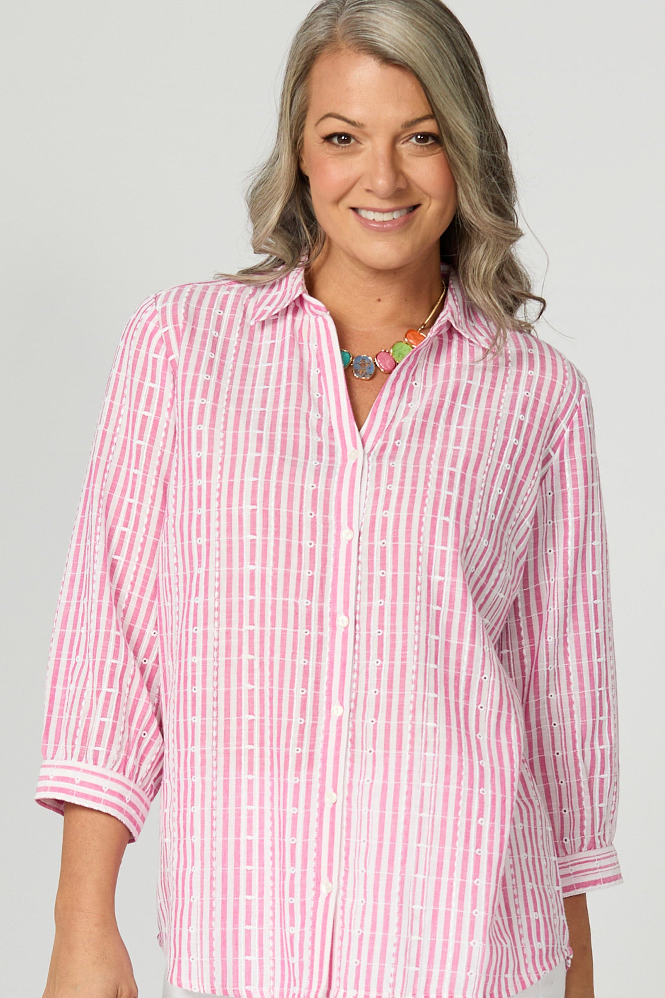 Discover timeless elegance with the Valdesi Collared Stripe 3/4 Sleeve Shirt in Geranium. Crafted from pure cotton with a yarn-dyed stripe and mini embroidery details, this shirt offers a refined yet casual look. The classic stand collar with a V-neck insert and button-down front adds sophistication, while the 3/4 sleeves feature delicate gathering at the cuff for a soft touch. The back yoke seam with light gathering provides an easy, relaxed fit.
