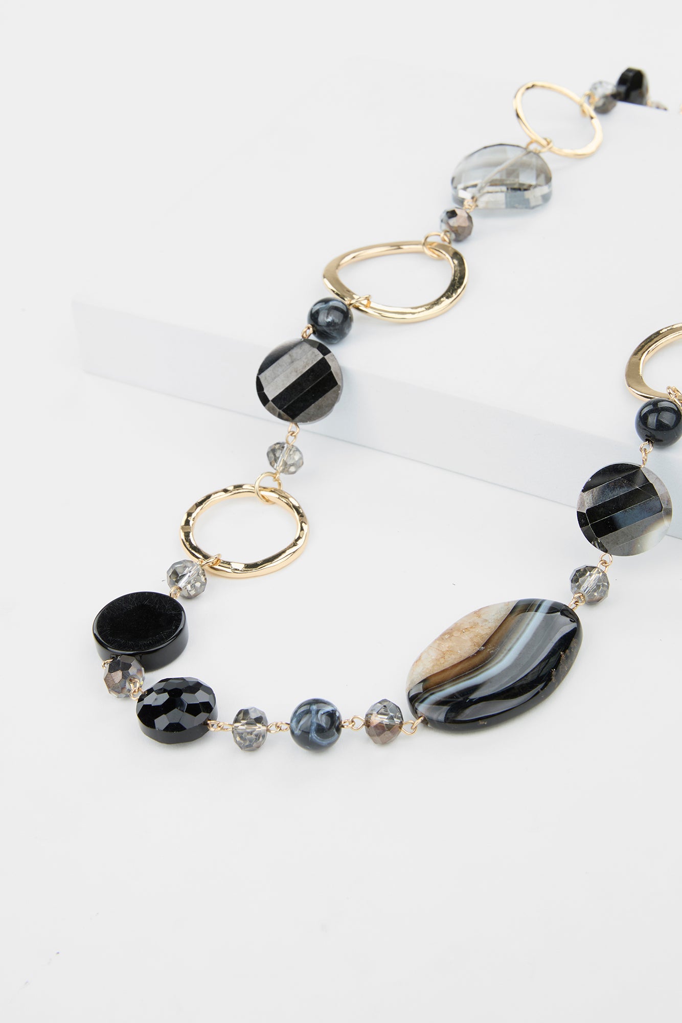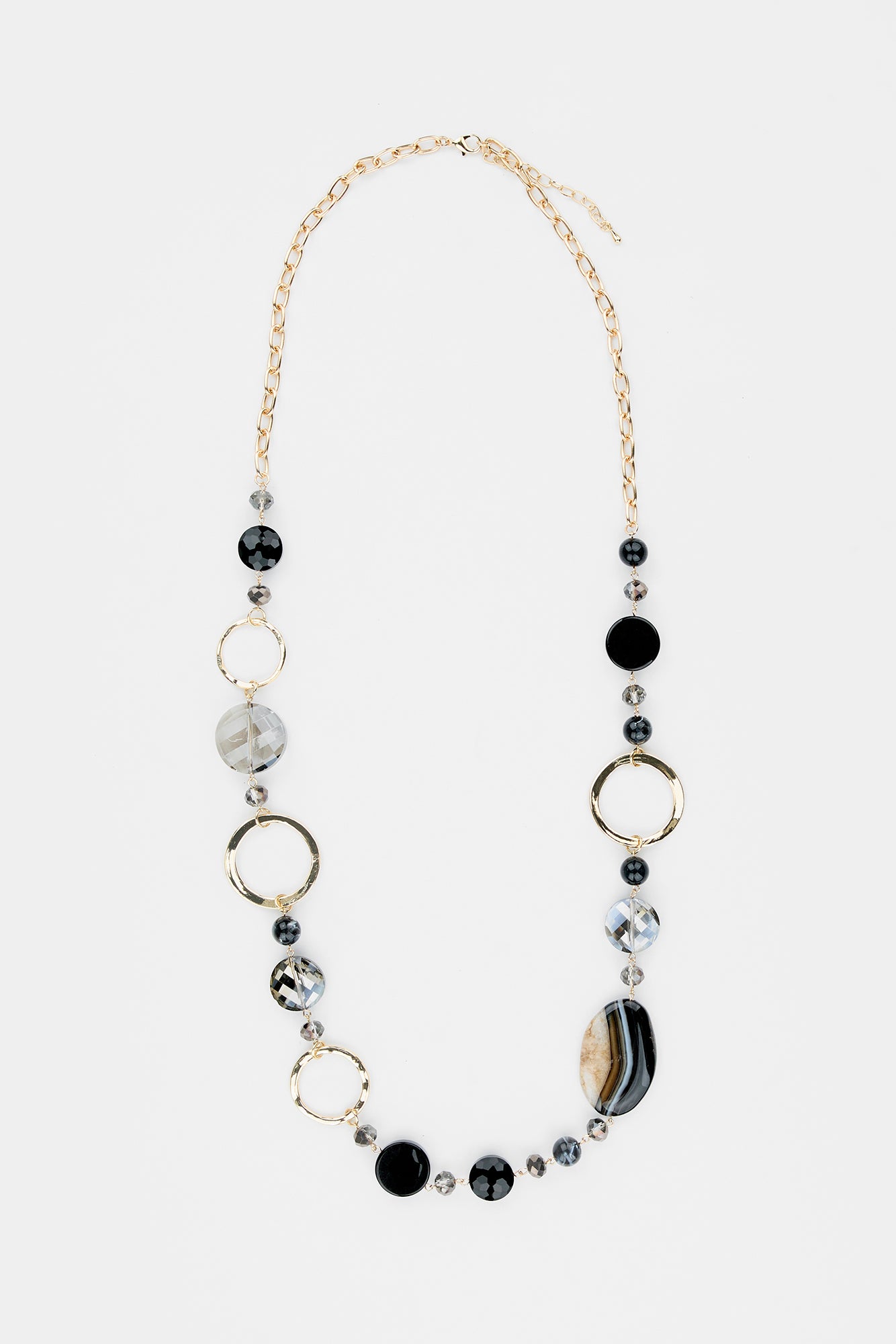 Strike the perfect balance between bold and refined with the Valora Long Necklace in Gold/Brown. Featuring a mix of glossy beads, earthy marbled tones, and sculptural gold-tone rings, this statement piece adds polished sophistication to any outfit. Ideal for elevating both casual and dressy looks.