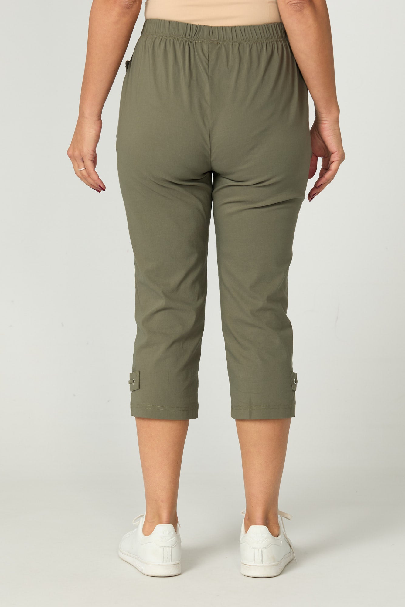 Be stylishly comfortable in these Vibe Stretch Crop Pants. The crop leg with side split detail features a small rectangular self-fabric panel with laced through silver coloured eyelets. The eyelets are carried through on the front welt pockets for added detail. Made from a lightweight Cotton-blend fabric, with a comfortable elastic waist band, you’ll be reaching for these pants everyday.
