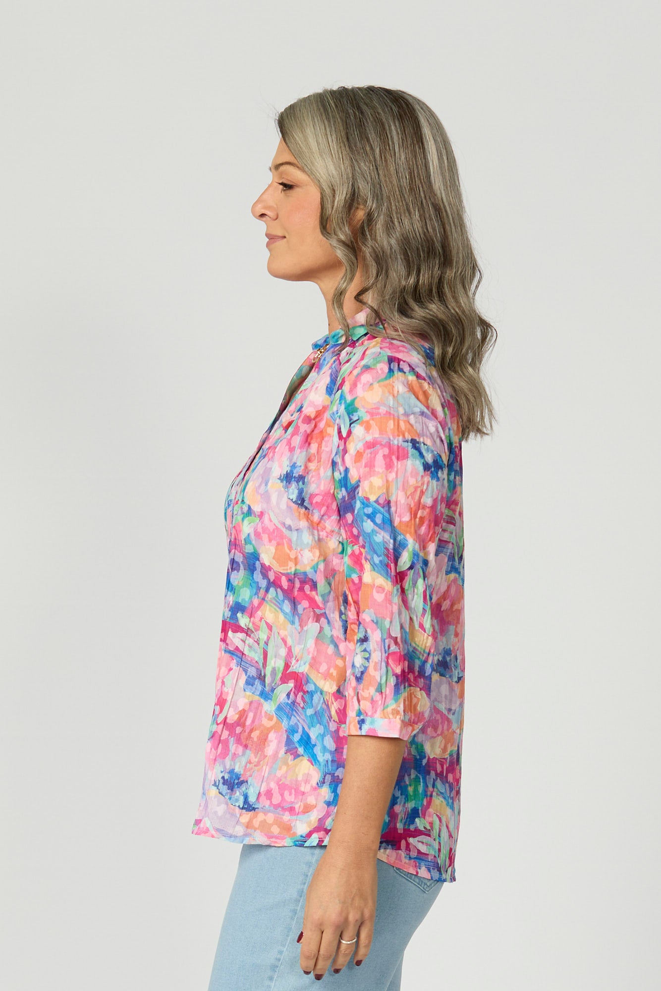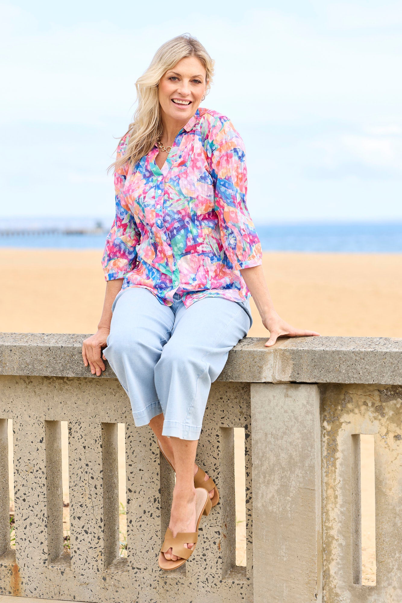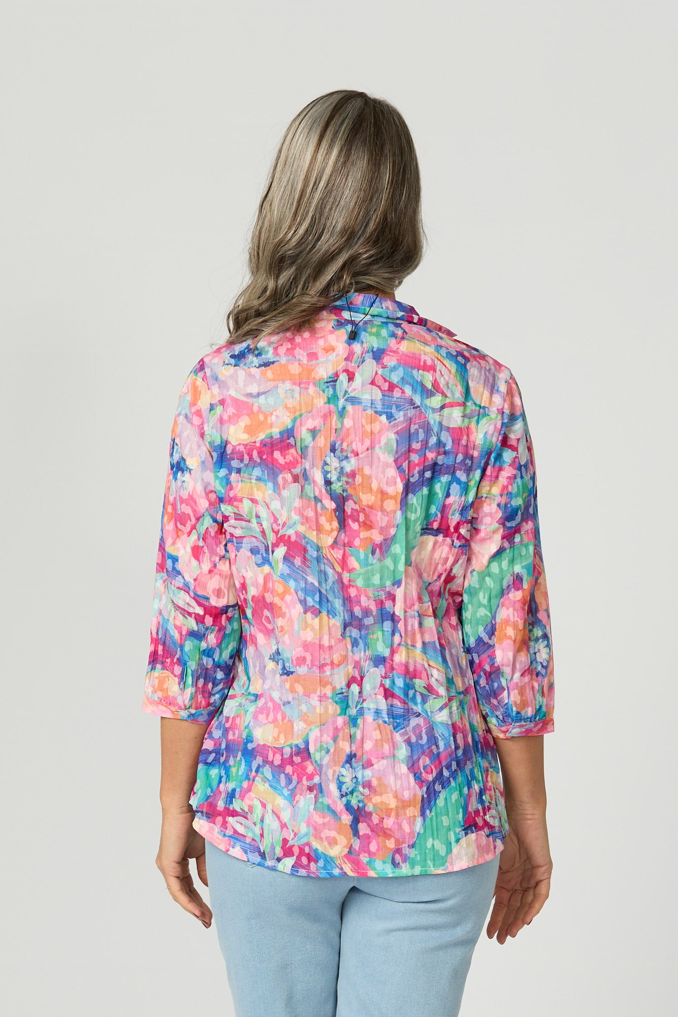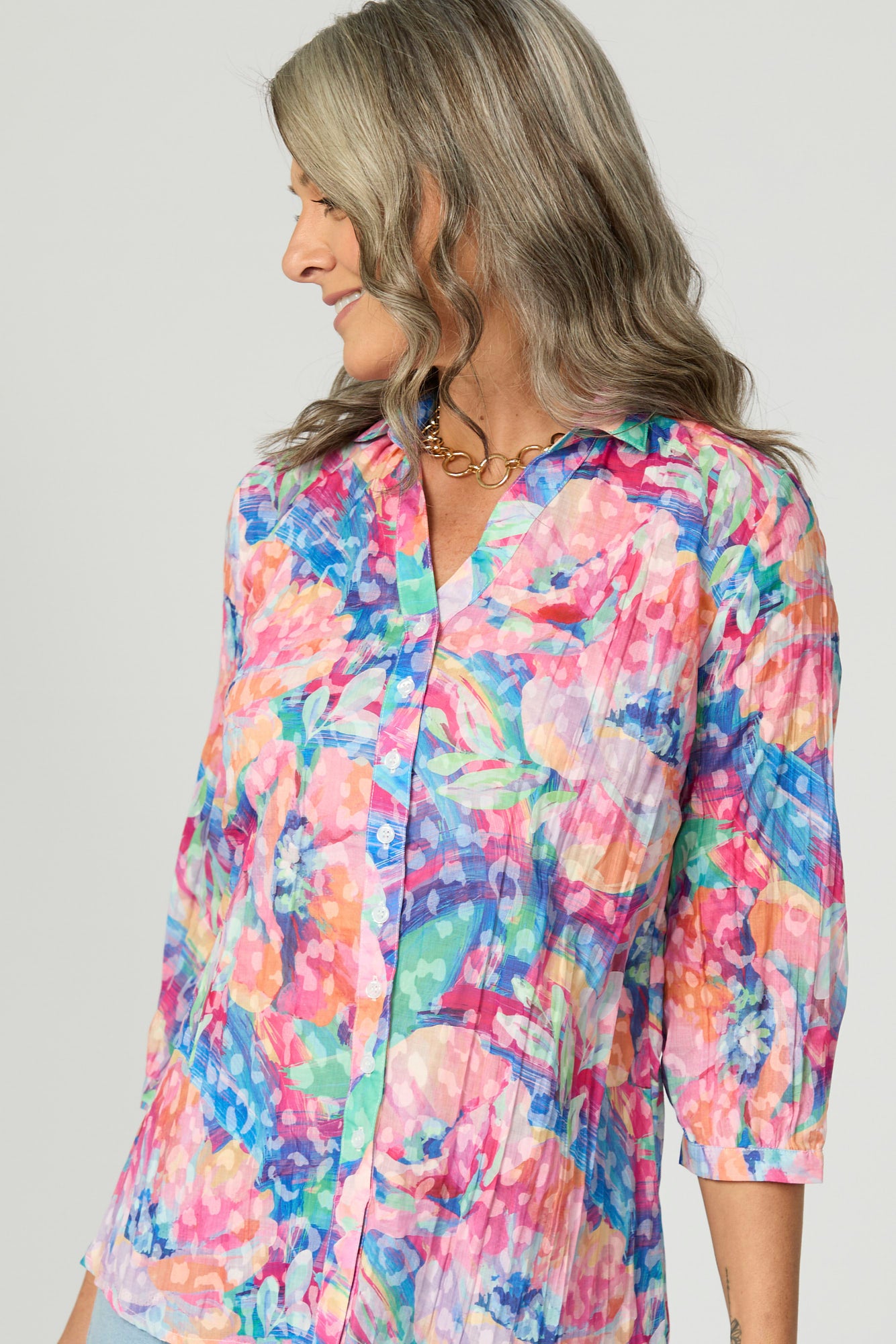 Discover effortless elegance with the Vista Crushed 3/4 Sleeve Print Shirt in Poppy Floral. This Floral print shirt features a textured fabric for added visual interest. The classic collar with a V-neck insert and button-down front offers a timeless look, while the front seams ensure a flattering fit. The 3/4 sleeves with cuffs and a curved hem provide both style and comfort. The front yoke seam adds a refined finishing touch.