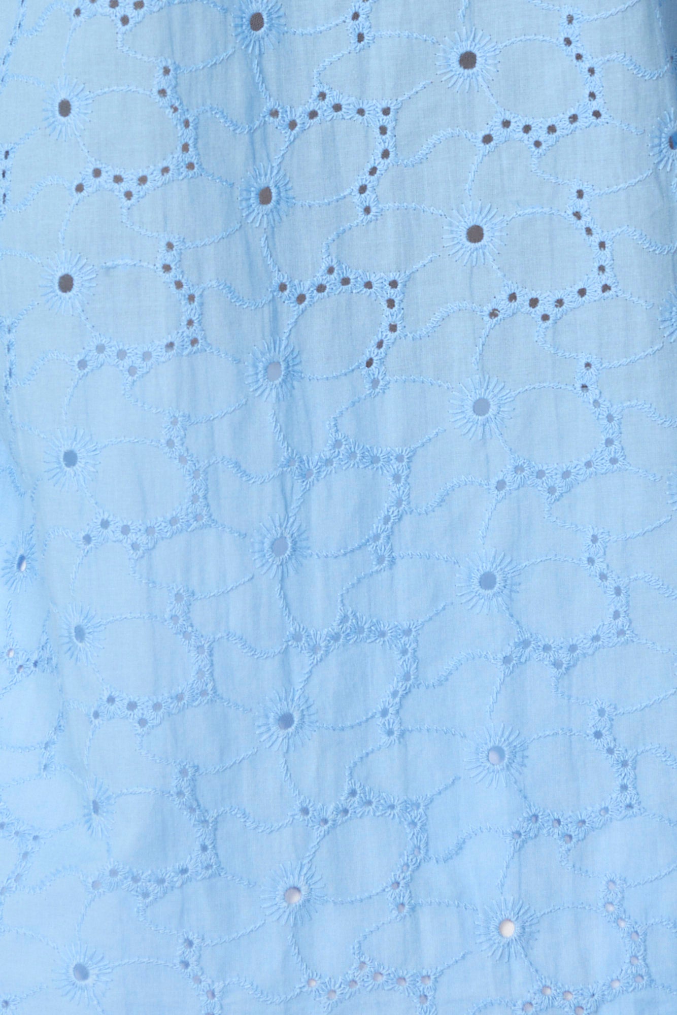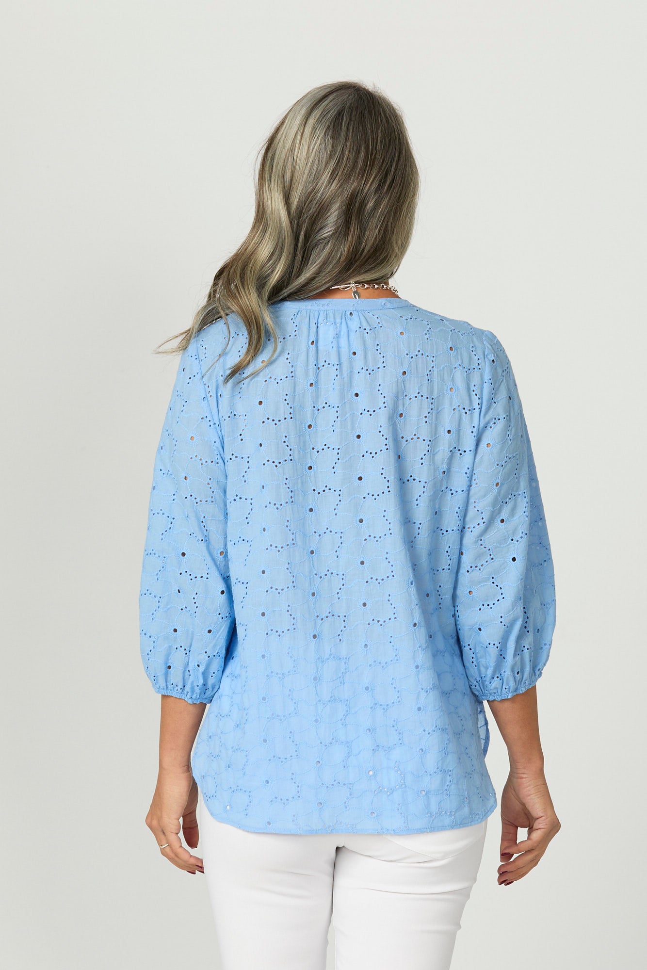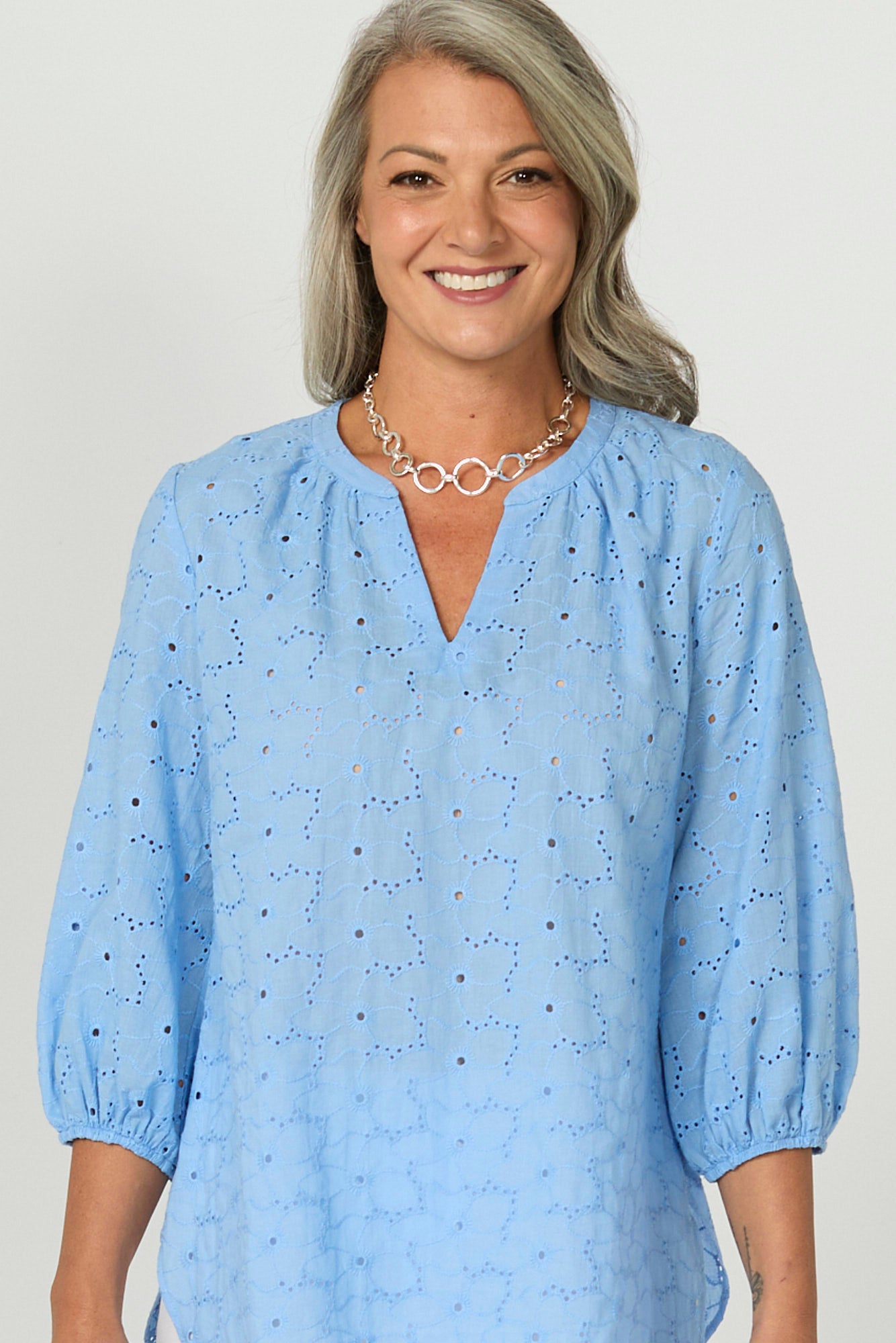 Embrace timeless charm with the Wendy Broderie 3/4 Sleeve Blouse in Cornflower Blue. Made in Australia, this beautifully detailed blouse features delicate broderie anglais floral fabric and a soft curved hem. The round neckline flows into a V-insert with gentle gathering, while the blouson sleeves and elasticated cuffs bring a touch of romantic elegance to your everyday look.