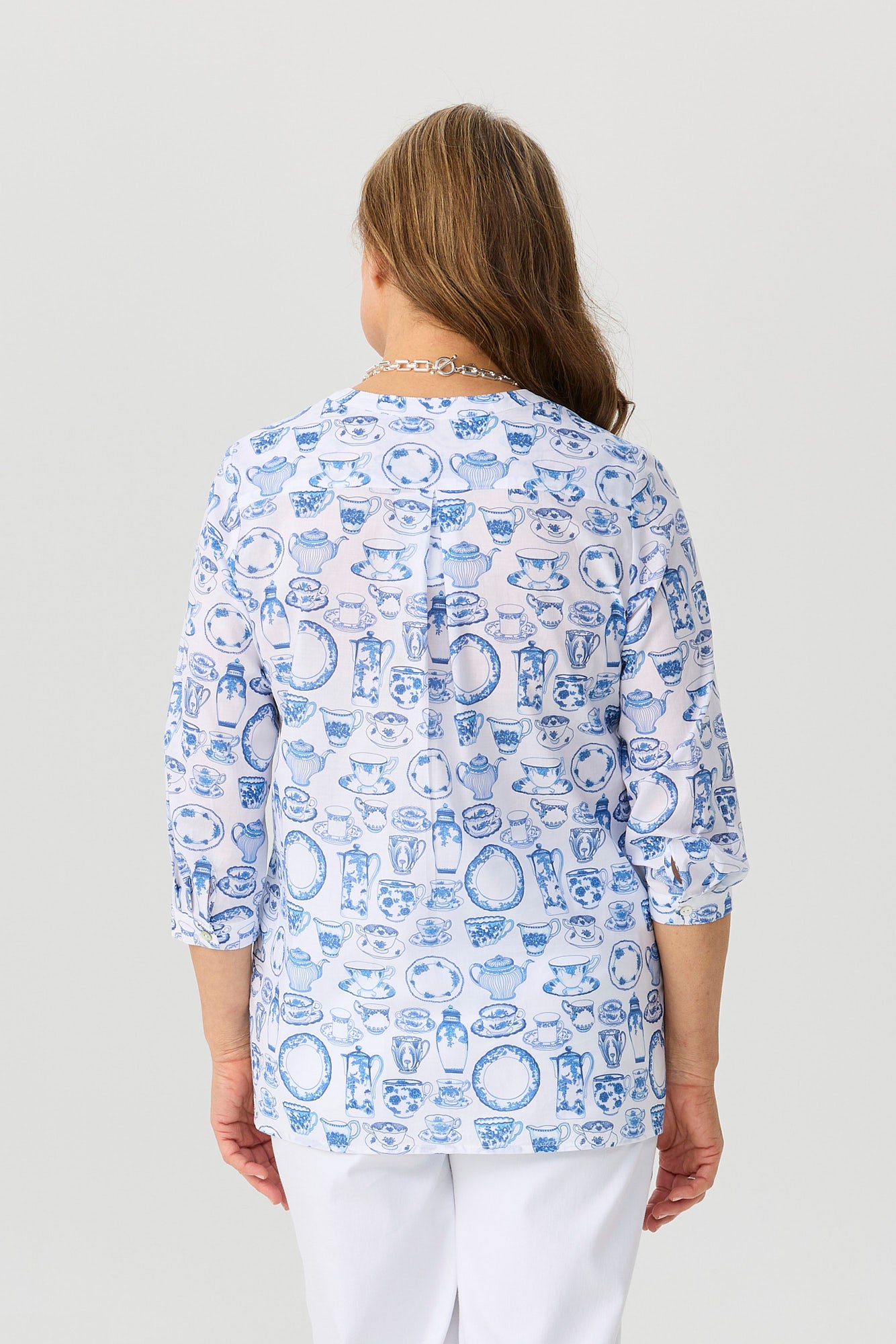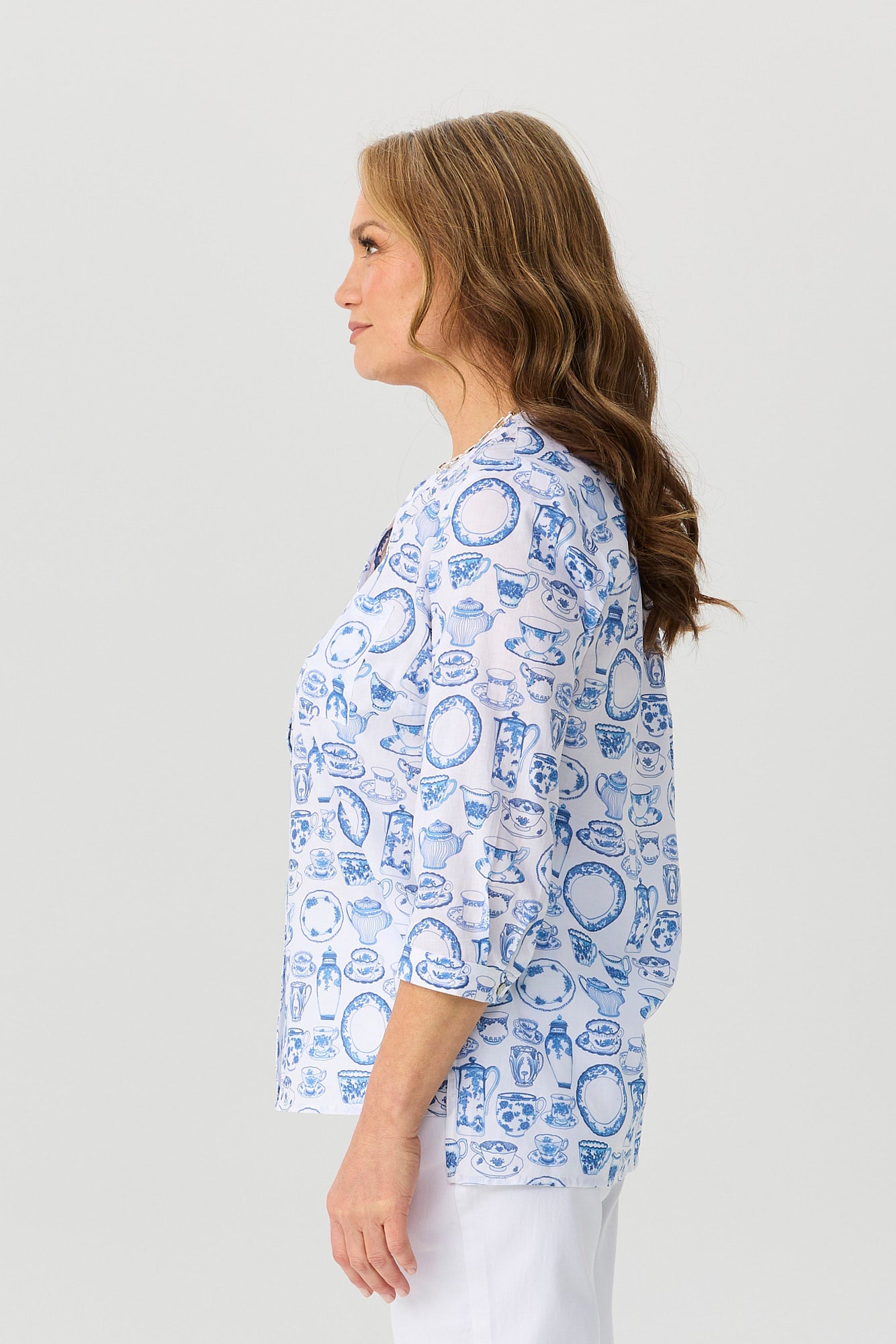 Step into timeless charm with the Wiltshire 3/4 Sleeve Open Neck Shirt in White/Blue. Featuring a whimsical blue china print on a crisp white base, this shirt combines classic inspiration with modern flair. Its open neckline and relaxed silhouette create a breezy, flattering fit—perfect for casual days or polished moments. The 3/4 sleeves add versatility and style, while the unique print brings a touch of vintage elegance to your wardrobe.