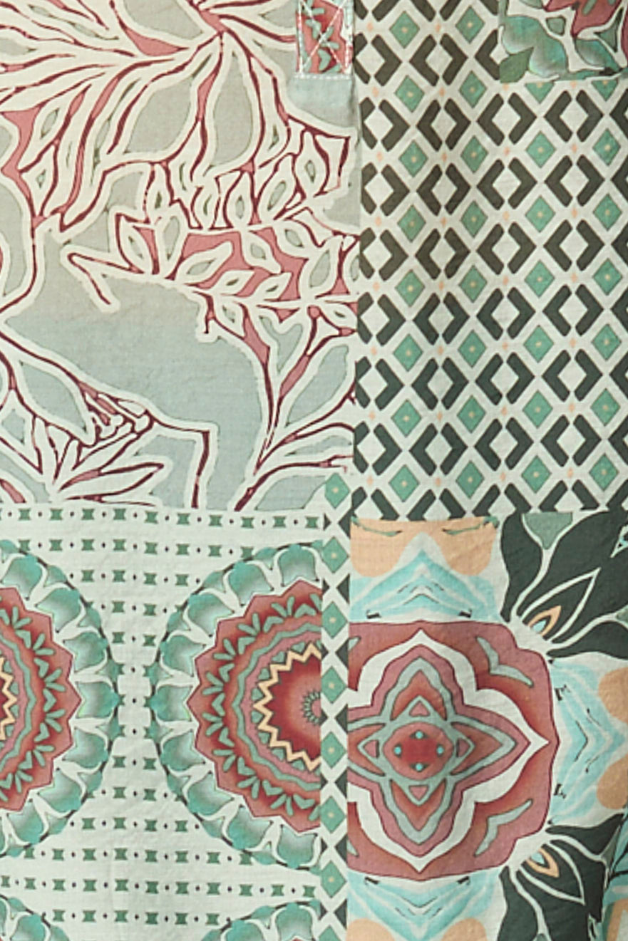 Brighten your look with the Zac 3/4 Sleeve Sharkbite Blouse in Teal Mix. Featuring a playful patchwork of geometric and floral prints, this lightweight blouse flows beautifully with its asymmetric hem and relaxed fit. The soft neckline with button detailing adds charm to this standout style.
